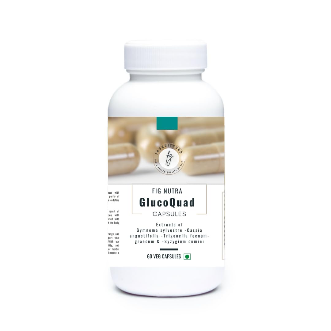 FiG Nutra - GlucoQuad harnesses the power of herbal extracts to offer a gentle, yet effective approach to metabolic wellness. It's an excellent choice for anyone seeking a natural method to support their health, integrating seamlessly into your daily regimen for sustained vitality. Comprehensive Approach to Metabolic Health: GlucoQuadhelps with the overall metabolic function. It's designed to assist in various aspects of metabolic health, such as minimizing cravings for sweet and optimizing nutrient absorption. Herbal Extracts Synergistic Effect: The combination of Gymnema sylvestre Plant Extract, Fenugreek Seed Extract, Cassia angustifolia Leaf Extract, and Syzygium cuminii provides a more comprehensive approach to managing and supporting metabolic health . The synergy of GlucoQuad's ingredients enhances their individual benefits, creating a more effective solution. Antioxidant Support: With ingredients rich in natural antioxidants, GlucoQuad helps safeguard against oxidative stress, which can affect overall vitality. These antioxidants play a supportive role in enhancing your body's resilience against daily stresses. Aids Digestive Wellness: The inclusion of Cassia Angustifolia known for its digestive benefits contributes to an overall smoother digestive process. This gentle support helps enhance your body's natural detoxification processes and digestive health, which is often linked with a more balanced metabolic profile. Our Commitment to Quality and Sustainability At FounditGood, we are committed to delivering only the highest quality products. Our FiG Nutra Capsules are produced in India under strict FSSAI GMP (Good Manufacturing Practices) standards, ensuring that each batch meets rigorous quality standards. We source our ingredients responsibly, supporting sustainable practices that contribute to the health of the planet. Enhanced Absorption and Bioavailability: The formulation of GlucoQuad is designed to maximize the absorption and bioavailability of its ingredients. This ensures that the body can effectively utilize the nutrients provided by the herbal extracts, making the supplement more efficient and beneficial. Supports Balanced Glucose Levels: GlucoQuad is designed with a unique herbal blend that gently supports the body's natural mechanisms. This supplement is an excellent choice for those looking to maintain their well-being with an emphasis on metabolic balance.