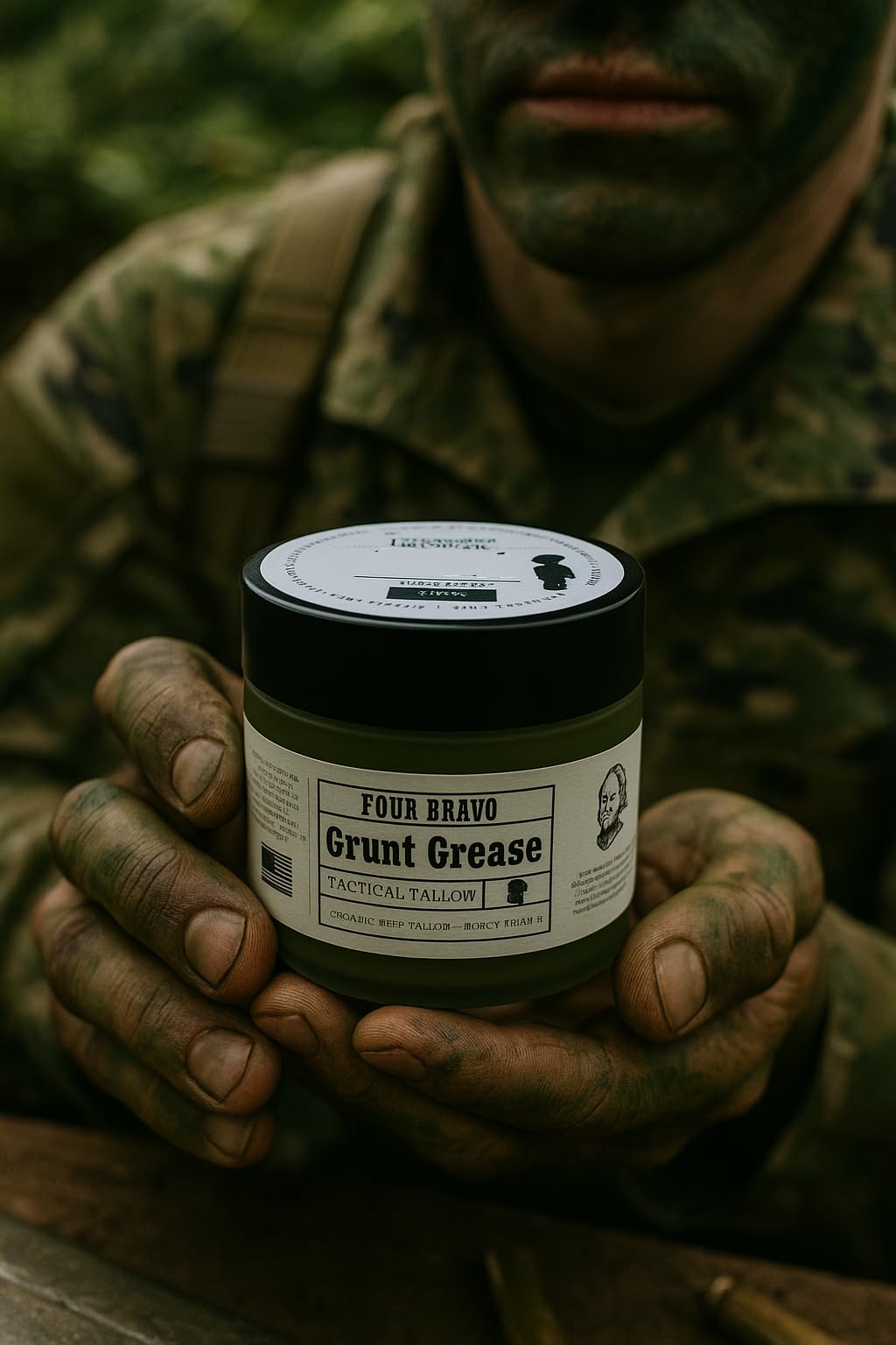 Grunt Grease by FOUR BRAVO, for the soldier or man who works as hard a soldier - a premium tactical tallow balm that combines the nourishing properties of wagyu beef tallow with GHK-CU, pure honey and vitamin E. This unique 2 oz moisturizer is handcrafted to deliver intense hydration for both face and body care. The natural formulation features carefully selected ingredients that work together to support skin health while providing deep moisturization. Perfect for those seeking a robust skincare solution, this organic moisturizer absorbs effectively into the skin without leaving a greasy residue. The thoughtfully designed packaging ensures easy application and storage, while the natural scents provide a subtle, pleasant fragrance. Whether used as part of your daily facial care routine or as an all-over body moisturizer, Grunt Grease offers a practical and effective solution for maintaining healthy, well-nourished skin.