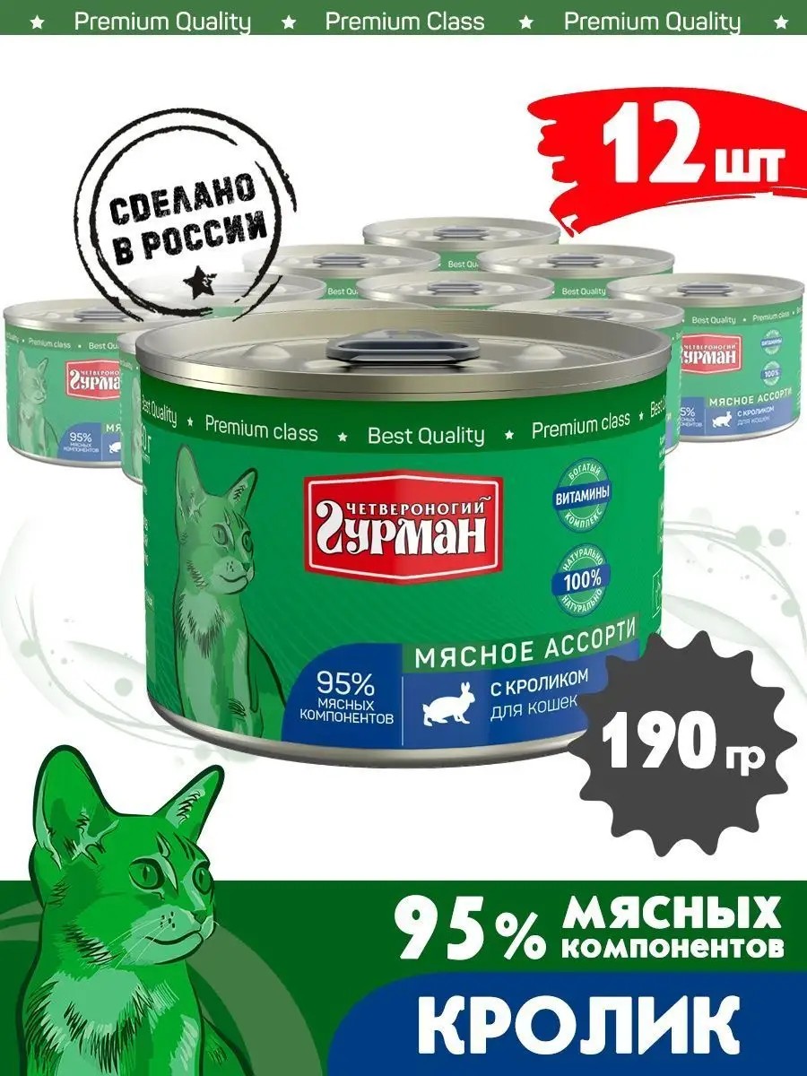 Влажный корм премиум класса Четвероногий гурман Мясное ассорти в ассортименте - это отборные консервы для кошек и котят всех пород. 95% настоящего мяса и субпродуктов в банке.