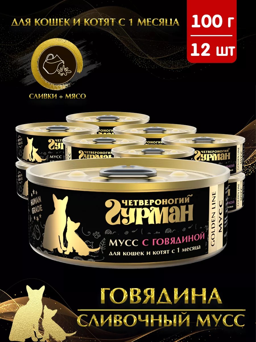 Golden Line Mousse is a select canned food for cats and kittens of all breeds, starting from 1 month old. Made from Human-grade meat and creamy sauce. Unique taste, creamy texture. An excellent treat even for picky cats. Developed for feeding the smallest kittens from 1 month. Recommended for pregnant and lactating cats. Promotes more abundant milk production. Can be given to adult animals: with digestive problems, decreased appetite, in the absence of teeth. 100% natural. Strict quality control at all stages of production with guarantees. Ingredients: meat, creamy sauce (cream, water, wheat flour, vegetable oil, taurine). Feeding rate: 30-50 g per 1 kg of animal weight. Use at room temperature. Recommended for cats with allergies or with sensitive digestion problems. Suitable for a single-protein diet. To diversify your pet's diet, we recommend trying "Soufflé for cats" by Four-legged Gourmet: 7140040 or 7140041. Suitable for all cat breeds: Persian, Maine Coon, Siberian, Neva Masquerade, Bengal, Abyssinian, British Shorthair, Scottish Fold, Sphynx, etc.
