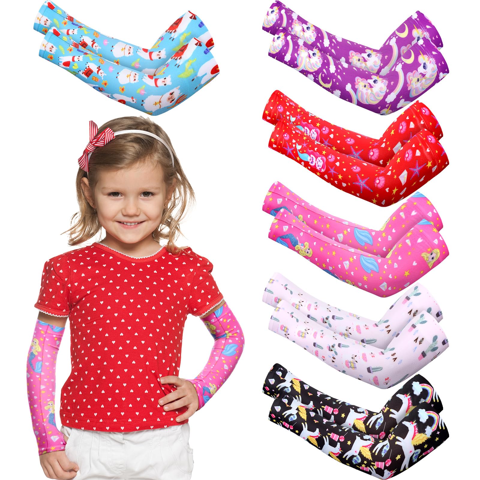 Features: The arm sleeves' lightweight nature allows them to be stored and carried effortlessly. Whether for a quick day trip or a longer vacation, packing these sleeves into a bag is a breeze. Their portability ensures your child is always prepared for impromptu outdoor fun without the bulk of extra clothing. These arm sleeves are the perfect accessory to complement any wardrobe, blending style with functionality. With their cute and colorful patterns, they offer essential sun protection while fitting seamlessly into your child's wardrobe. Dress up and protect skin with sleeves that enhance every outfit's appeal. Specifications: Material: 100 spandex Color: colorful Size: Length is 13.78 inches 35 cm Package includes: 6 Pairs of Eczema sleeves Notes: Manual measurement, please allow slight errors on size. The color may exist a slight difference due to different screen displays.Adorable Designs of Kids Love: our arm sleeves feature charming cartoon patterns including alpacas, mermaids, and ponies Loved by children, these vibrant designs also come in various colors to match any outfit, inspiring kids to proudly wear their protective gear while showing off their favorite designs during any activity. Generous Set for Daily Needs: each pack includes 6 pairs of cartoon patterned arm sleeves, each measuring 13.78 inches and featuring a handy thumbhole This generous quantity ensures your child always has a pair ready for any occasion Share with family members, or keep extras on hand for convenient swapping on busy days. Versatile Use, Endless Adventures: designed for multiple sports, these arm sleeves are suitable for basketball, baseball, golf, football, and volleyball But their versatility does not end here—they are also ideal for other outdoor pursuits such as fishing, cycling, hiking, camping, and more Equip your child with a sleeve that meets all their adventure needs. Sun and UV Protection: ensure peace of mind during outdoor play with these arm sleeves that offer sun and UV protection For protecting delicate skin from harmful UV rays, these sleeves minimize the risk of sunburn, allowing your child to enjoy outdoor activities like cycling or running without worry of overexposure to the sun. Comfort with Quality Materials: crafted from spandex, these kids' arm sleeves ensure a soft and gentle touch against the skin The lightweight and breathable design guarantees comfort even during long hours of wear With elastic properties, these sleeves won't easily break or lose shape, making them a durable option for all your child's active adventures.