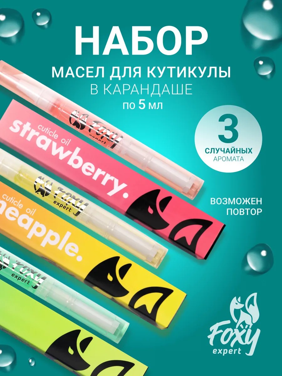 Масло для кутикулы карандаш с кисточкой от Foxy Expert. В маникюрный набор входит 3 разных аромата. Сбалансированный состав нежно ухаживает за Вашими ноготками, обеспечивая здоровье и правильный рост. ИНСТРУКЦИЯ: снять колпачок, поворачивать противоположную от кисточки сторону по часовой стрелке до появления масла на кисточке, затем нанести и распределить масло по кутикуле и ногтевой пластине. Дать впитаться. ВНИМАНИЕ: при первом применении может потребоваться 15-20 оборотов до выхода пузырька воздуха. Компактный флакон с защитным колпачком от протекания позволяет брать с собой в любую, даже маленькую дамскую сумку или клатч. Питательные элементы глубоко проникают в кожу и непосредственно в матрицу ногтя, превосходно быстро впитывается, не оставляя жирных следов, и обладает тонким ненавязчивым ароматом. Мягкие щетинки равномерно распределят его по всей поверхности. Крем для размягчения кожи вокруг ногтя обладает питательными элементами, быстро впитывается, не оставляя жирных следов. Масло размягчитель профессиональный — это необходимое и нужное профилактическое средство после проведения маникюра для ногтей и нанесения таких средств, как гель лак, шеллак, праймер и база. Набор из 3 ароматов высылается случайным образом, в ассортименте приятные, нежные и ненавязчивые ароматы: клубника, яблоко, апельсин, ананас, молоко и мед, цветов. Сыворотку рекомендуем использовать совместно с такими косметическими средствами, как сухое масло монарды для ногтей и его укрепления, лечебное противогрибковое средство от грибка и вросших ногтей, антисептик, а также другие витамины и витаминные комплексы для оздоровления пальцев рук и ног. Отличный подарок на день рождения, свадьбу и для вашей жены, девушки, дочери. Посмотрите весь наш ассортимент товаров для маникюра просто нажав на логотип компании черную лисичку. Обещаем вы останетесь довольны! Приятных покупок! Foxy Expert