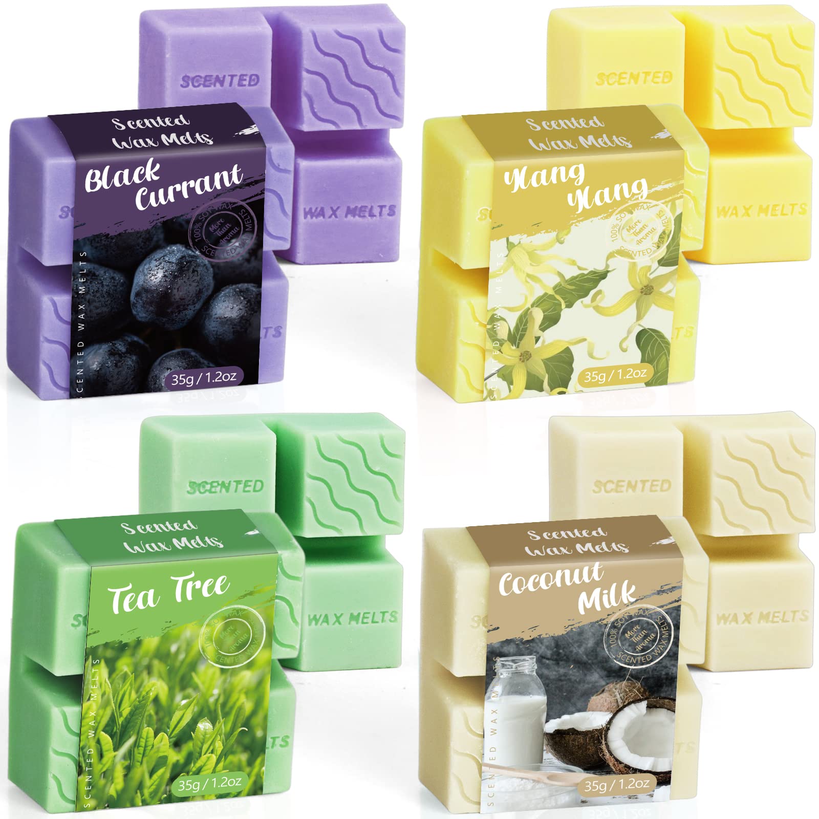 ?Package? If you have any questions about the product, you can contact us at any time.If you are not satisfied, you can exchange this product or get your money back.?Application? Compatible with several types of burners, including cake warmer, electrical wax melting burner and candlestick.Simply put the cubes in the moles and enjoy the pleasant fragrance.Or simply place it in a drawer or a closet like fragrance bag and it will also smell good.?Long -lasting? Each cube can last about 6 hours.A total of 16 cubes (4 fragrances), each fragrance has 4 cubes and weighs 35 g/1.2 OZ.Perfect for daily use, aromatherapy, spa etc. ?Natural ingredients? The wax melting is made from soy wax and natural fragrance oils.They are biodegradable, environmentally friendly and sustainable.It can be easily cleaned with warm water and soap.?4 fragrances? Tea tree, ylang-ylang, black currant, coconut & milk.The wax melting spread a pleasant fragrance in the air to create an environment in which you can relax.?PACKUNG? Bei Fragen zum Produkt können Sie sich jederzeit an uns wenden. Wenn Sie nicht zufrieden sind, können Sie dieses Produkt umtauschen oder Ihr Geld zurückerhalten. ?ANWENDUNG? Kompatibel mit mehreren Arten von Brennern, einschließlich Tortenwärmer, elektrischem Wachsschmelzbrenner und Kerzenwärmer. Einfach die Würfel in den Stövchen geben und den angenehmen Duft genießen. Oder legen Sie es einfach in eine Schublade oder einen Schrank wie Duftbeutel und es wird auch gut riechen. ?LANGLEBIG? Jeder Würfel kann ca. 6 Stunden lang halten. Insgesamt 16 Würfel (4 Düfte), jeder Duft hat 4 Würfel und wiegt 35 g/1,2 oz. Perfekt für den täglichen Gebrauch, Aromatherapie, Spa usw. ?NATÜRLICHE INHALTSSTOFFE? Die Wachsschmelzen werden aus Sojawachs und natürlichen Duftölen hergestellt. Sie sind biologisch abbaubar, umweltfreundlich und nachhaltig verbrennbar. Es kann leicht mit warmem Wasser und Seife gereinigt werden. ?4 DÜFTE? Tee Baum, Ylang-Ylang, Schwarze Johannisbeere, Kokosnuss & Milch. Die Wachsschmelzen verbreiten einen angenehmen Duft in der Luft, um eine Umgebung zu schaffen, in der Sie sich entspannen können.Duftwachs für Duftlampe, Wax Melts für Kerzen Wärmer, Vegan Wachsschmelzen von Sojawachs, Raumduft Geschenkset für Muttertag, Weihnachten, Geburtstag, Yoga, Entspannung, Meditation, 4 Stück 4 Düfte-s2