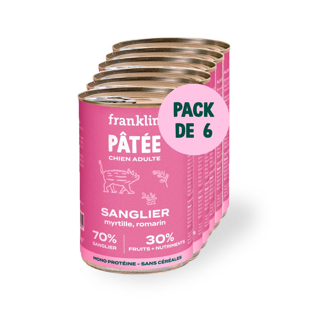 NUTRITIONAL INFORMATION: Crude protein 9 , carbohydrates 2.2 , crude fat 8 , crude ash 2 , crude fiber 0.8 , moisture 78 , calcium 0.3 , phosphorus 0.25 , omega 3: 0.1 , omega 6: 1 , metabolizable energy: 116 kcal 100g. LIMITED INGREDIENTS: 70 wild boar, 3 dried chicory pulp, 1 dried blueberry, 0.4 calcium carbonate and 0.1 dried rosemary. GRAIN FREE: No grains in our dog food, whether rice, wheat or corn, for better digestion. WEIGHT CONTROL: Our wet food is three times less caloric than kibble. Thanks to its richness in water, this pâté allows your dog to feel full faster and longer. MAXIMUM FLAVOR: Rich in meat, our dog pâté releases attractive odors for your gourmand. Ideal for fussy dogs!. MONO-PROTEIN: The absence of protein other than wild boar helps reduce bloating and thus facilitates digestion. PERFECT DOG PATE: Prepared without carcasses, our dog pâté contains 70 wild boar meat, rich in protein and ideal for optimal digestion. We add blueberry, for its antioxidant properties and rosemary, to stock up on vitamins.VALEURS NUTRITIVES : Protéines brutes 9 , glucides 2,2 , matières grasses brutes 8 , cendres brutes 2 , cellulose brute 0,8 , humidité 78 , calcium 0,3 , phosphore 0,25 , omega 3 : 0,1 , omega 6 : 1 , énergie métabolisable : 116 kcal 100g. INGRÉDIENTS LIMITÉS : 70 de sanglier, 3 de pulpe de chicorée séchée, 1 de myrtille séchée, 0,4 de carbonate de calcium et 0,1 de romarin séché. SANS CÉRÉALES : Aucune céréale dans nos pâtées pour chien que ce soit du riz, du blé ou du maïs pour un meilleur transit. CONTRÔLE DU POIDS : Notre nourriture humide est trois fois moins calorique que les croquettes. Grâce à sa richesse en eau, cette pâtée permet à votre chien de se sentir rassasié plus rapidement et plus longtemps. UN MAX DE SAVEUR : Riche en viande, notre pâtée pour chien dégage des odeurs attirantes pour votre gourmand. Idéale pour les chiens difficiles !. MONO-PROTÉINE : L'absence de protéine autre que le sanglier permet de diminuer les ballonnements et ainsi faciliter la digestion. PÂTÉE PARFAITE POUR CHIEN : Préparée sans carcasses, notre pâtée chien contient 70 de viande de sanglier, riche en protéines et idéale pour une digestion optimale. On ajoute de la myrtille, pour ses propriétés antioxydantes et du romarin, pour faire le plein de vitamines.
