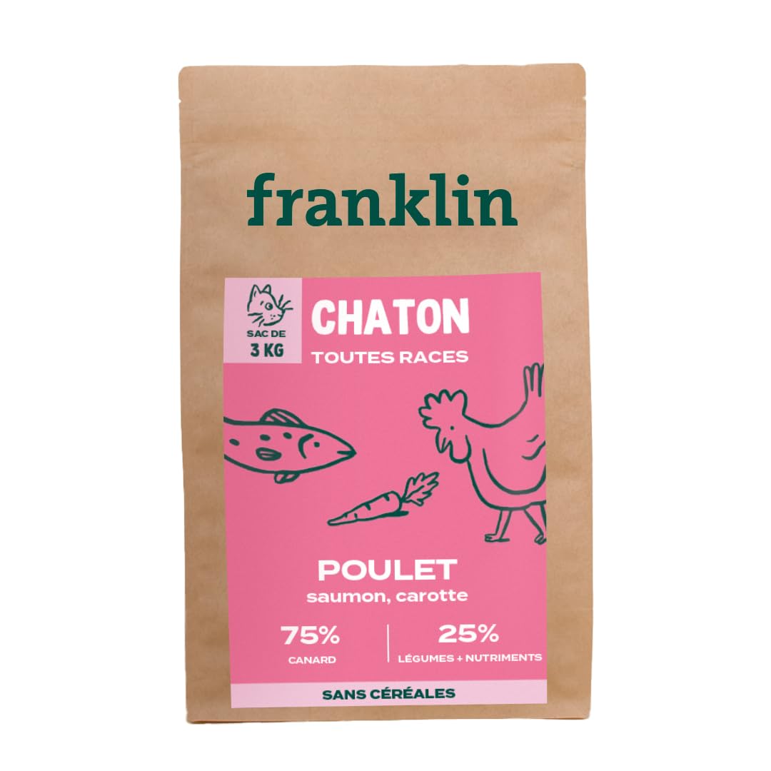 FRANKLIN: A French brand, our kibble is made with high-quality ingredients, grain-free, GMO-free, with no artificial colors or flavors to provide a complete and balanced diet for your kitten. GRAIN-FREE: Our kibble is free of rice, wheat, corn, and all other grains. Instead, we have sweet potatoes or legumes to facilitate transit, digestion, and maintain intestinal health. LARGE QUANTITIES OF CHICKEN AND SALMON: a complete kitten food, specially designed to strengthen its immune system and awaken its palate. IDEAL FOR A SHINY COAT: Contains salmon rich in omega-3 to promote healthy skin and coat. KITTEN KIBBLE TO PROMOTE GROWTH: lots of meat, protein, vitamins, and minerals to help your kitten grow well!FRANKLIN : Marque française, nos croquettes sont conçues avec des ingrédients de haute qualité, sans céréales, sans OGM, sans colorants ni arômes artificiels pour offrir une alimentation complète et équilibrée à votre chaton. SANS CÉRÉALES : Dans nos croquettes, exit le riz, le blé, le maïs et toutes les autres céréales. À la place, nous avons de la patate douce ou des légumineuses pour faciliter le transit, la digestion et préserver la santé intestinale. DU POULET ET DU SAUMON EN GRANDE QUANTITÉ : une nourriture pour chaton complète, conçue spécialement pour renforcer ses défenses immunitaires et éveiller son palais. IDÉALE POUR UN POIL BRILLANT : Contient du saumon riche en omégas 3 pour favoriser la santé de la peau et du pelage. LA CROQUETTE CHATON POUR FAVORISER SA CROISSANCE : beaucoup de viande, de protéines, de vitamines et de minéraux pour aider votre chaton à bien grandir !.