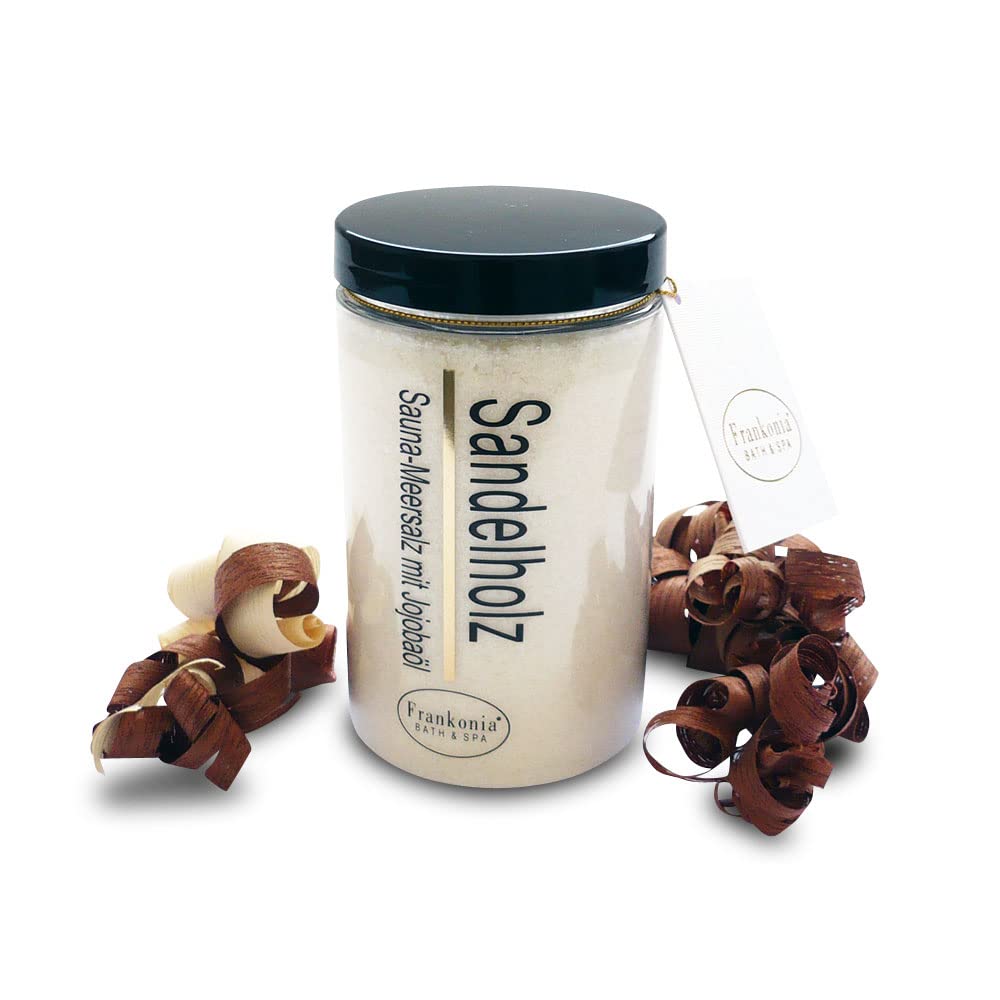 Sandalwood is the fine fragrance for the man - also in the sauna.Fine oils and the refreshing male fragrance of sandalwood are soothing for the skin and soul.A high -quality care product from the bathing cosmetics product lines from Frankonia Bath Spa.For the perfect sauna experience.With nourishing jojoba oil and vitamin E. without color and preservatives, vegan.Sauna sea salt is the ideal addition to relaxing and refreshing saunas.Rub and feel and enjoy the soothing peeling and scrub effect.Also ideal for the hammam application or in the steam bath Ingredients ingredients Maris Sal, Simmondsia Chinensis Seed Oil, perfum, Helianthus Annuus Seed Oil, Ascorbyl Palmitaten, Lecithin, Tocopherol, Benzyl Benzoate, Hexyl Cinnamal, Limonene, Linalool. Instructions Apply the sauna sea salt to the moist, showered or thinly grated skin.As usual, saunas and then shower gently massively and thoroughly. Morewithdrawing effects, maintains the skin and promotes the hemorrhage.The result: a wonderfully soft and bright healthy skin feeling.Haves detoxifying and deep cleaning.Fine grain and intensive smell for a fragrant wellness massage experience.Gentle elimination of skin vendors and dandruff for all skin types, especially for sensitive and dry skin.Quality manufactured in Germany and enriched with high-quality jojoba care oil and vitamin E, rich in valuable minerals.Our range: coconut, pink grapefruit, deep pacific, mango peach, lavender, sandalwood, pomegranate, vanilla, lemongras, honey-almond, wild rose.Premium sauna peeling salt with minerals made of pure sea salt.Vegan, untreated and free of preservatives or additives.Sandelholz ist der feine Duft für den Mann - auch in der Sauna. Feine Öle und der erfrischend männliche Duft nach Sandelholz sind wohltuend für Haut und Seele. Ein hochwertiges Pflegeprodukt aus den Badekosmetik Produktlinien von Frankonia Bath SPA. Für das perfekte Saunaerlebnis. Mit pflegendem Jojobaöl und Vitamin E. Ohne Farb- und Konservierungsstoffe, vegan. Sauna-Meersalz ist die ideale Ergänzung für erholsames und erfrischendes saunieren. Einreiben und den wohltuenden Peeling und Scrub Effekt spüren und geniessen. Ideal auch für die Hamam Anwendung oder im Dampfbad INHALTSSTOFFE ZUTATEN Maris Sal, Simmondsia Chinensis Seed Oil, Parfum, Helianthus Annuus Seed Oil, Ascorbyl Palmitate, Lecithin, Tocopherol, Benzyl Benzoate, Hexyl Cinnamal, Limonene, Linalool. GEBRAUCHSANWEISUNG Sauna-Meersalz auf die feuchte, geduschte oder dünn mit Honig eingeriebene Haut auftragen. Wie gewohnt saunieren und danach sanft massierend und gründlich abduschen. MehrRückfettende Wirkung, pflegt die Haut und fördert die Duchblutung. Das Ergebnis: Ein wunderbar weiches und strahlend gesundes Hautgefühl. Wirkt entschlackend und tiefenreinigend. Feine Körnung und intensiver Geruch für ein duftendes Wellness-Massage-Erlebnis. Schonende Beseitigung von Haut-Unreinheiten und Schuppen für alle Hauttypen, vor allem für sensible und trockene Haut. Qualität hergestellt in Deutschland und angereichert mit hochwertigem Jojoba-Pflege-Öl und Vitamin E, reich an wertvollen Mineralien. Unser Sortiment: Kokos, Pink Grapefruit, Deep Pacific, Mango-Pfirsich, Lavendel, Sandelholz, Granatapfel, Vanille, Lemongras, Honig-Mandel, Wilde Rose. Premium Sauna-Peeling-Salz mit Mineralstoffen aus reinem Meersalz. Vegan, unbehandelt und frei von Konservierungsstoffen oder Zusatzstoffen.Frankonia BATH SPA Sauna Salz Peeling – Sandelholz 400g - Meersalz m. Jojobaöl Vitamin E Body Scrub – Dusch- und Körperpeeling für alle Hauttypen – vegan – ohne Parabene
