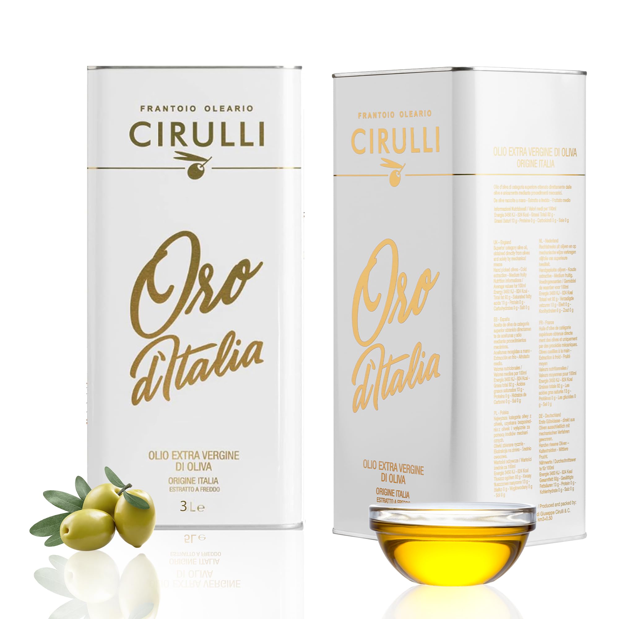 Cirulli Extra Virgin Olive Oil (EVO) and Organic of the highest quality. From three generations of experience in the Puglia region, processing Coratina monocultivar olives, comes the Oro d'Italia selection, an oil with exceptional organoleptic properties. Our production is further enhanced by our certified organic line. You can find all the information on our website. We are close to all our customers thanks to dedicated support for any information. Il Frantoio Oleario Cirulli has been operating in the sector for approximately 70 years. When Nicola Cirulli was an agricultural entrepreneur, following his instincts and recognizing his own organizational abilities, in the 1950s he began milling olives in Andria (Apulia) and started producing extra virgin olive oil. Giuseppe, Nicola Cirulli's son, continues the business, assisted by his sons Nicola and Raffaele, who are beginning to introduce innovations. INSTRUCTIONS FOR USE Use at lower temperatures, for example, for dressings, dips, or cutting at medium temperature. Store in a cool, dark place to maintain freshness.Cirulli Huile d'olive extra vierge italienne extraite à froid, EVO (2 x 3 Litres)DESCRIPTION DU PRODUIT DESCRIPTION DU PRODUIT CirulliHuile d'olive extra vierge EVO et BIO de la plus haute qualitéDe l'expérience de trois générations dans la terre des Pouilles dans la transformation des olives monocultivar Coratina naît la sélection Oro d'Italia, une huile aux propriétés organoleptiques particulières. Notre production est enrichie par la production de la ligne certifiée biologique. Vous pouvez trouver toutes les informations sur notre site Web. Nous sommes proches de tous nos clients grâce à une assistance dédiée pour toute information.Il Frantoio Oleario Cirulli opère dans le secteur depuis environ 70 ans.Lorsque Nicola Cirulli était un entrepreneur agricole, suivant son instinct et sentant ses propres capacités d'organisation,Dans les années 1950, il a commencé à moudre à Andria (Pouilles) et a commencé à produire de l'huile d'olive extra viergeGiuseppe, fils de Nicola Cirulli, continue l'entreprise, aidé par ses fils Nicola et Raffaele, qui commencent à apporter des innovations MODE D'EMPLOI À utiliser à des températures plus basses, par exemple pour les pansements, les trempettes ou la coupe à température moyenne. Conserver dans un endroit frais et sombre pour conserver la fraîcheur.