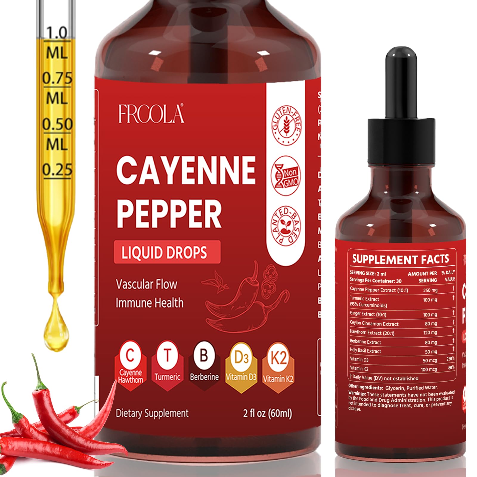 Frcola Cayenne Pepper Liquid Drops Vascular Flow Support Supplement with Turmeric Ginger Vitamin D3 K2 Non-GMO Vegan Formula 2 Fl Oz