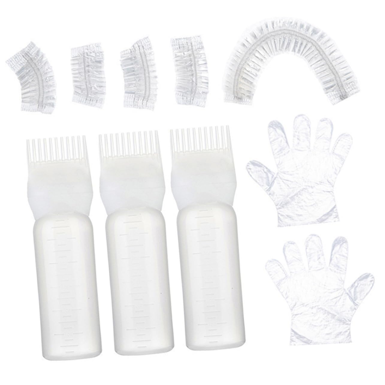 Package List 3 x bottles 2 x gloves 1 x hair cap 4 x ear muffs Features -Material:Plastic bleach hair kit - Color: White hair dying set - Size: 6.90X4.80X4.80cm/2.71X1.89X1 oil bottles for hair. - All types of tools suit for any hairstyles such like long hair, short hair, curly hair or straight hair hair coloring tools. - Easy and convenient to use, save your efforts for home and salon using. Durable to use salon hair dyeing tool. - Full tools set for safe and easy hair dyeing, convenient to use, fit for both professionals and beginner hairstyling tool set. - The root comb applicator bottle is flexible and practical to make sure the dyeing smoothly hair bleach. - The hair oil applicator can help to apply coloring to hair evenly. Gloves can protect your hand from dirty and wet hair dye accessories. Goods Information hair oil bottle Suitable for any new user.hair applicator tool Whether you are long hair or short hair, this tool set is for any style you want.hair dying set The hair dye coloring kit is used in spa, salon, hairdressing, home coloring, highlights, hair treatment, etc.hair bleach It is very simple to use DIRECTIONS keep clean