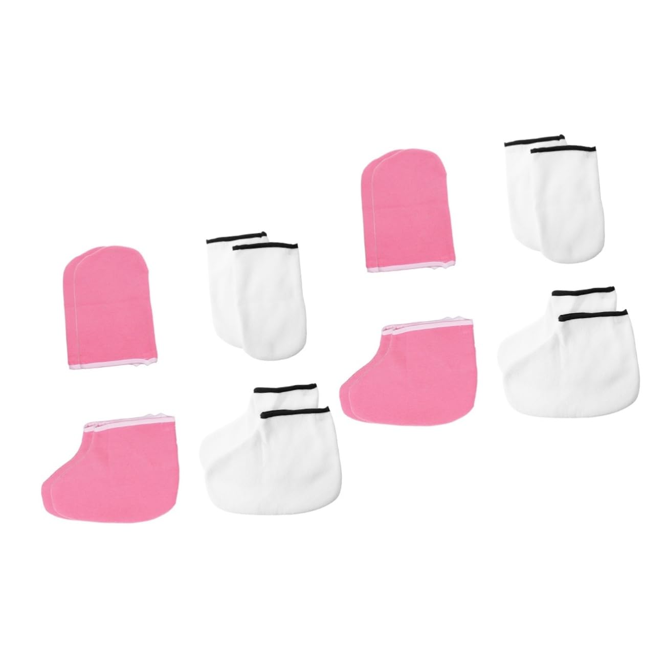Package List 4 x pairs of foot covers 4 x pairs of gloves Features - Note: This set includes 2 pairs of foot covers and 2 pairs of gloves paraffin wax gloves. - Color: White+Pink Exfoliating Foot Covers Gloves. - Material: Polyester, Knitted Fabric paraffin gloves. - Size foot cover: About 25.00X20.00X0.50cm/9.82X7.87X0.20inch Exfoliating Care Gloves. - Size glove: About 25.00X15.00X0.50cm/9.82X5.89X0.20inch Foot Care Covers. - It is easy to clean, does not fade, feels comfortable, and does not fall off the line rejuvenating gloves. - Our gloves and foot covers can play a very good role in heat preservation Skin Care Gloves. - Can help maximize moisture and nutrients get into the skin for better absorption paraffin wax mittens. - They are suitable for professional beauty salon paraffin wax bath spa or home use Care Moisturizing Gloves. - Before sleep, you can apply moisturizer or cream, put on liners and then mitts and foot covers. You may be pleasantly surprised to find your rejuvenated and beautified hands and feet when you wake up paraffin wax mitts. Goods Information paraffin Our product provides a safe and convenient feet and hand skin care.rejuvenating gloves First, them in gloves and foot covers to help absorption.Soothing Skin Warmer Then, put your hands and feet into our gloves and foot covers for 10 to 15 minutes.paraffin wax mittens Evenly apply wax or skin care products to your hands and feet