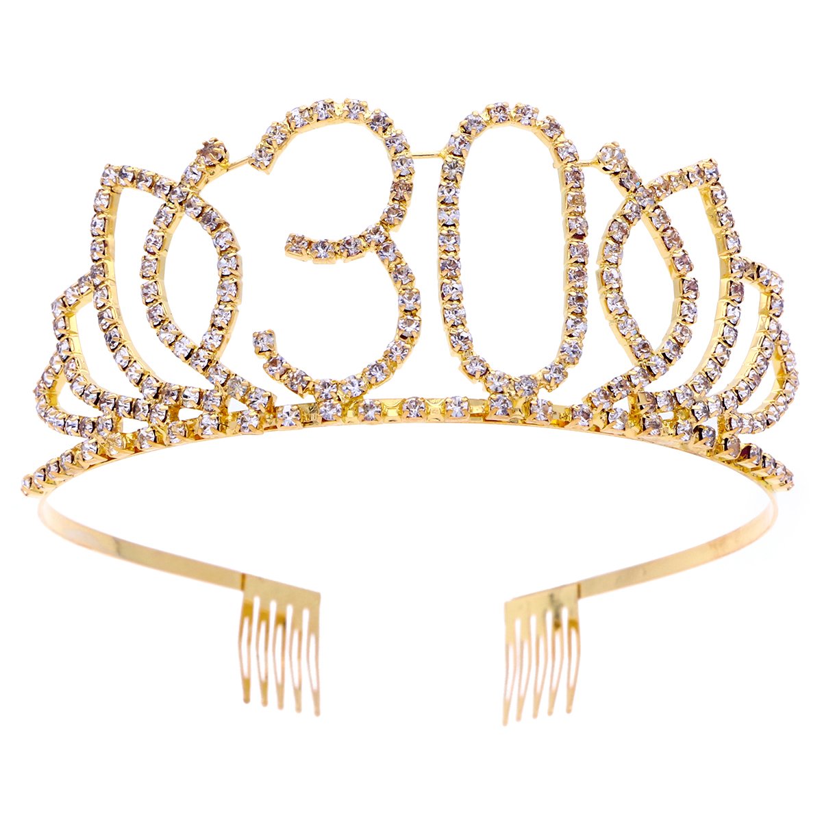 Description Get this extraordinary diamond tiara for yourself, your daughter, other friend to make her the focus of attention at the party of her 30th birthday! The crystal and beautiful shining rhinestones will add more sparkle and elegance to the whole outfit which makes her more glamorous and look like a real princess. With number 30 design on the tiara, it's a perfect birthday costume decor for 21th birthday party to leave unforgettable happy time for the wearer. Features - Color: Gold - Material: Metal and rhinestone. - Size: 14x13.1x5.2cm. - Perfect accessory for a gril's 30 birthday celebration party. A great gift for yourself, family, friends, or other relatives. - Creative party accessory with shining and exquisite crystal rhinestones which show royal glory all the time, making the host of the party look like an elegant princess. - With combs design to keep tiara in place all the day for stable wearing, not easy to fall out. - One size fits most. Free size design fits most girls. Package Including 1 x Girl's 30th Birthday Tiara Crystal Rhinestone Birthday Tiara Queen Crowns Headband with Hair Combs Clip for 30th Birthday Party Prom Decorations (Gold)