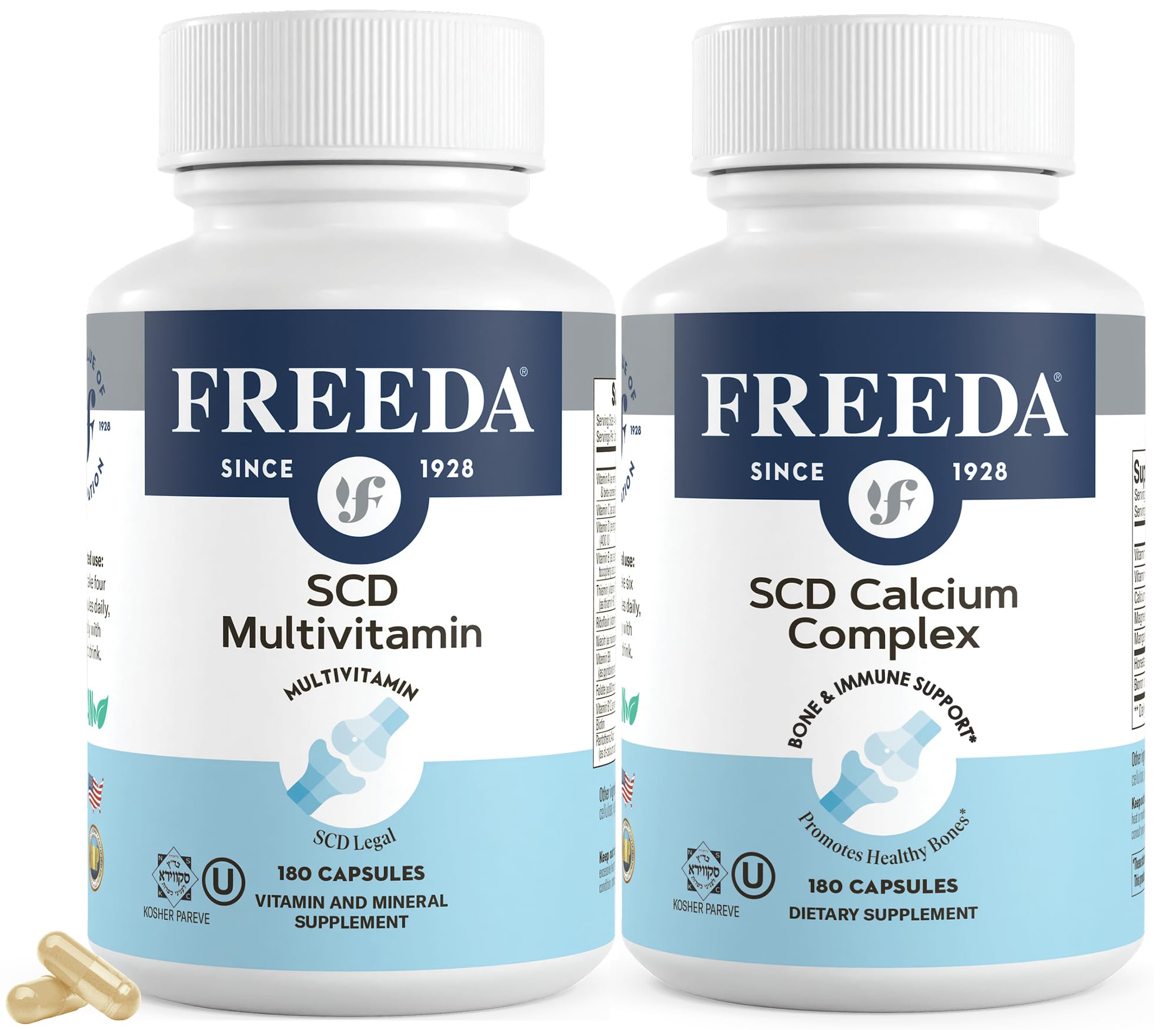 The Freeda SCD Bundle delivers two clean, carefully crafted supplements — SCD Multivitamin and SCD Calcium Complex — designed for individuals following the Specific Carbohydrate Diet (SCD) or those seeking gentle, nutrient-rich support. SCD Multivitamin offers a balanced blend of essential vitamins and minerals, including active forms of folate and B12 for enhanced absorption, antioxidants for cellular protection, and a broad spectrum of nutrients to help maintain natural energy and overall wellness. SCD Calcium Complex complements the multivitamin by focusing on bone and mineral support. Made with a gentle, well-absorbed form of calcium and paired with other important co-factors, it provides comprehensive support for skeletal health and mineral balance. Both products are Kosher, vegan-friendly, gluten-free, lactose-free, and free from sugar, starch, gelatin, yeast, and artificial colors or flavors. Manufactured in a GMP-certified facility in the USA and tested for identity, purity, potency, heavy metals, gluten, and microbiology, they meet the highest quality standards. With over 90 years of trust, Freeda continues to provide clean, effective supplements for those who need them most — now conveniently paired in one bundle. Directions: SCD Multivitamin: Adults take 4 vegetable capsules daily, preferably with food and drink (2 with breakfast, 2 with lunch). SCD Calcium Complex: Adults take 6 vegetable capsules daily, preferably with food and drink. What's Included: 1 bottle – SCD Multivitamin (180 vegetable capsules – 45 servings) 1 bottle – SCD Calcium Complex (180 vegetable capsules – 30 servings) These statements have not been evaluated by the Food and Drug Administration. This product is not intended to diagnose, treat, cure, or prevent any disease.TRUSTED QUALITY SINCE 1928 – Kosher, vegan-friendly, made in a GMP-certified facility in the USA, and rigorously tested for purity and potency. Both formulas are SCD Legal and made without unnecessary additives. EASY DAILY ROUTINE – Take 4 capsules of SCD Multivitamin (2 with breakfast, 2 with lunch) and 6 capsules of SCD Calcium Complex daily, preferably with food and drink. SCD CALCIUM COMPLEX – BONE MINERAL SUPPORT – Crafted with a preferred form of calcium that is gentle on the stomach, plus a balanced combination of nutrients to support bone strength and overall mineral balance. . SCD MULTIVITAMIN – BROAD NUTRIENT COVERAGE – Delivers a well-rounded mix of vitamins and minerals, including active forms of folate and B12. Formulated for sensitive digestion and made without gluten, lactose, gelatin, sugar, starch, or artificial additives. . TWO ESSENTIAL SCD-FRIENDLY FORMULAS – Bundle includes Freeda's SCD Multivitamin and SCD Calcium Complex to help fill common nutrient gaps for those following the Specific Carbohydrate Diet or seeking a clean, gentle supplement routine.
