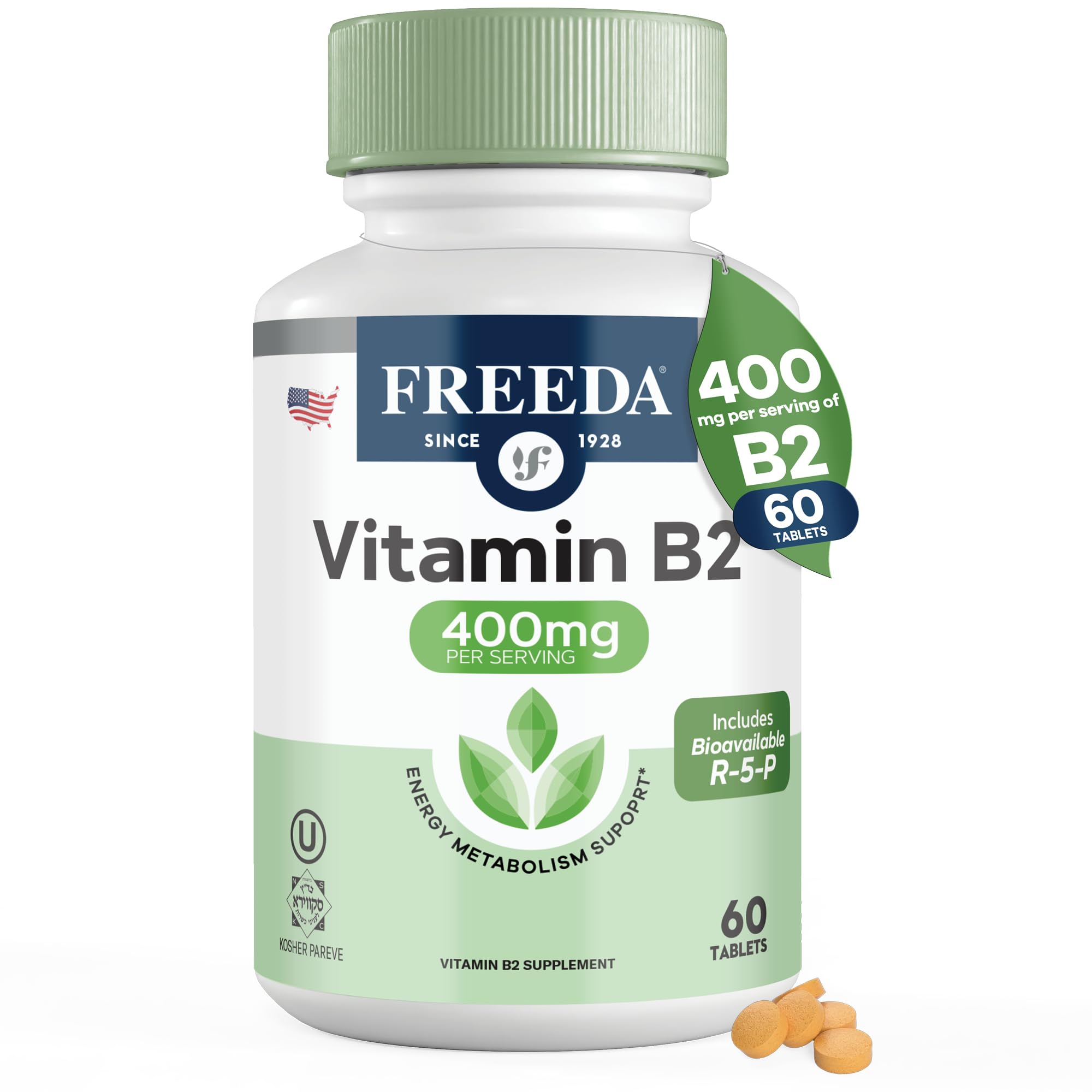 MADE IN THE USA – TRUSTED SINCE 1928 – Manufactured in a GMP-certified, third-party tested facility for purity and potency. Synonymous with quality and care, Freeda has been trusted for nearly a century by families and health professionals. CLEAN VEGAN FORMULA FOR SENSITIVE DIETS – Vegan, Non-GMO, Gluten-Free, Soy-Free, Sugar-Free and Kosher Pareve. Contains no gelatin, lactose, artificial colors or flavors. A pure vitamin for those seeking honest, minimal-ingredient supplementation that fits special dietary needs. . EASY TO SWALLOW TABLETS – These smooth coated small tablets are gentle on the stomach and easy to take. Our 2 tablet serving size is designed to give you flexibility—take both together or split the dose (one with breakfast and one with lunch), which may help support smoother digestion and better nutrient intake. . SUPPORTS ENERGY, METABOLISM NERVE FUNCTION – Vitamin B 2 plays a central role in converting carbohydrates, fats, and proteins into fuel while aiding red blood cell formation and oxygen transport. Maintaining adequate vit B2 levels helps combat tiredness and promotes steady energy throughout the day. . WITH BIOACTIVE RIBOFLAVIN-5-PHOSPHATE (R-5-P) – Works faster by combining standard B2 vitamin 400mg with 10 mg of the coenzyme form R-5-P, which your cells can use immediately for efficient energy conversion and metabolic function. Supports healthy oxygen use and helps nourish nervous system cells for sustained clarity and vitality. . HIGH-POTENCY B2 400 MG FORMULA FOR ENERGY HEAD COMFORT – Provides 400 mg of pure riboflavin Vitamin B2 per serving (2 tablets) to support cellular energy, metabolism, and overall neurological balance. B2 riboflavin is often recommended as part of nutritional protocols that help maintain head comfort and reduce occasional tension associated with fatigue. .