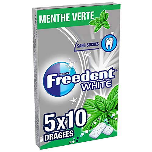 A delicious spearmint flavored chewing gum for fresh breath and clean, healthy teeth.White Spearmint Dragées Without Sugar 70G. FREEDENT. Chewing gum. Confectionery. Sweet grocery store. Un chewing-gum au délicieux parfum de menthe verte pour une haleine fraîche et des dents propres et saines.White Menthe Verte Dragées Sans Sucres 70G. FREEDENT. Chewing-gum. Confiserie. Epicerie sucrée.