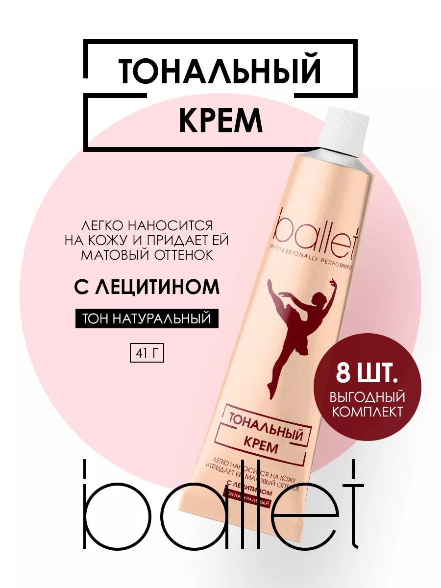 Freedom Ballet Foundation for all skin types, Natural with lecithin, 41g / decorative cosmetics. The set consists of 8 pcs. Price per set. Every girl dreams of eliminating skin imperfections without cosmetic intervention! For such cases, we have created a creamy foundation from Ballet with lecithin. This mattifying foundation for any skin type evens out skin tone and texture, controls shine, and protects from environmental aggression. The foundation serum provides a comfortable feeling for the skin throughout the day and does not clog pores. - Easy to apply and distributes perfectly; - Evenly covers the skin and gives it a matte shade; - Lasts throughout the day. . Active ingredients provide effective care against skin imperfections. Result: the skin acquires an even and delicate color, becomes smooth and velvety. The main advantage of packaging the cream in an aluminum tube is its higher protective properties and the absence of reverse air intake during application, which ensures better preservation of the cosmetic product during storage and use. Anti-imperfection product / foundation / decorative cosmetics for the face Foundation for the face contains: Aqua, Paraffinum Liquidum, Helianthus Annuus Seed Oil, Stearic Acid, Titanium Dioxide, Paraffin, Lanolin, PEG-400, Glyceryl Stearate, Potassium Cetyl Phosphate, Cetearyl Alcohol, Triethanolamine, Phenoxyethanol, Talc, Methylparaben, Ethylparaben, Lecithin, Dimethicone, Parfum, Benzyl Salicylate, Limonene, CI 77491, CI 77492, CI 77499.