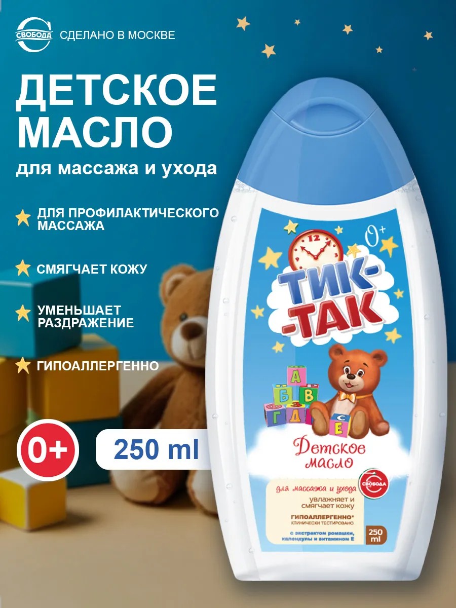 Детское масло для массажа ТИК - ТАК многофункциональное средство по уходу за чувствительной кожей ребенка с первых дней его жизни. Масло предназначено для проведения профилактического массажа и для смягчения кожи младенцев после гигиенических процедур. Состав Детского масла Тик-Так обогащен ценными экстрактами и витамином Е, которые обеспечивают деликатный уход за кожей малыша:Экстракт ромашки бережно ухаживает и смягчает, защищает кожу от негативного влияния окружающей средыЭкстракт календулы - оказывает успокаивающий и противовоспалительный эффектВитамин Е препятствует сухости кожи, защита от УФ-излучения, питание кожиПрименение: для оздоровительного массажа предварительно нанести масло на руки, разогреть его, растерев в ладонях. Равномерно распределить масло на тело и начать процедуру массажа. Наносить на чистую и сухую кожу после водных процедур. Рекомендуется детям любого возраста, а также подходит взрослым. Взрослым наносить на чистую влажную кожу, затем промокнуть полотенцем.