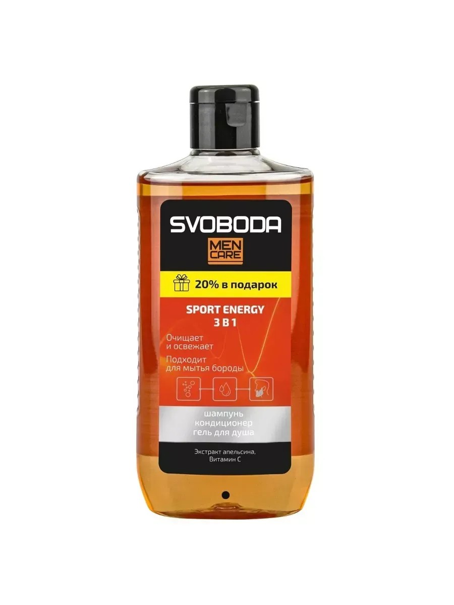 Svoboda Men Care 2-in-1 Sport Energy Shampoo and Conditioner, 290 ml. This 3-in-1 shampoo, conditioner, and shower gel provides ideal care for men's hair and body. A neutral cleansing base effectively cleanses, while orange extract and vitamin C, combined with a nourishing coconut oil supplement, protect the skin from drying out, soften, and refresh. The bright citrus scent invigorates and lifts the spirits.
