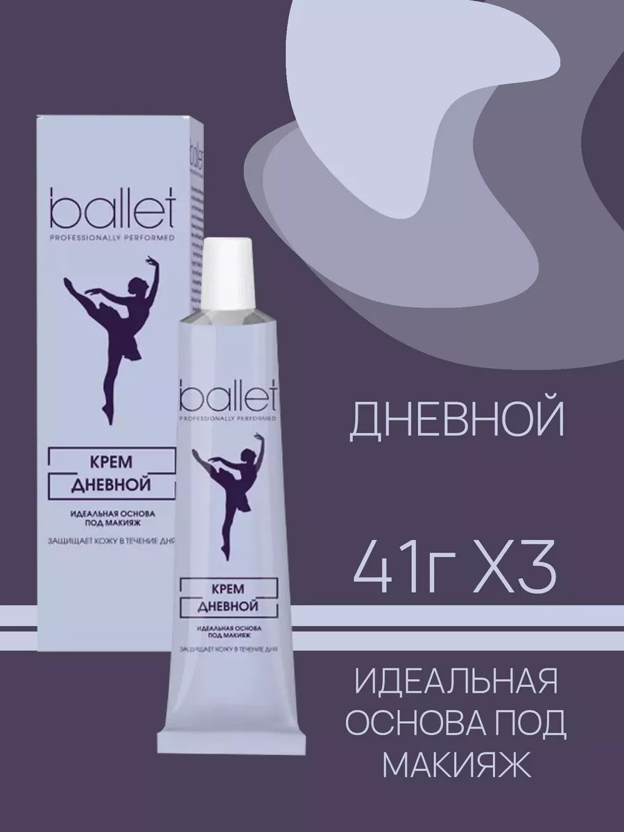 Ballet Day Face Cream. 3 pieces, 41 g each. Suitable for all skin types. Nourishes and moisturizes, improves firmness and elasticity, and protects against adverse environmental influences. It serves as an ideal makeup base, ensuring even distribution of makeup. It absorbs quickly without leaving a sticky or greasy film. Suitable for daily use. The main advantage of aluminum tube packaging is its enhanced protective properties and the absence of reverse air intake, which helps preserve the cosmetic product during storage and use.