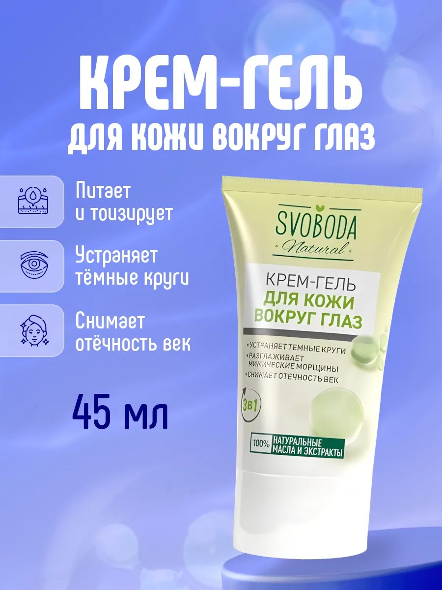 Свобода Svoboda Natural Крем-гель для кожи вокруг глаз – это натуральное средство для борьбы с первыми признаками старения и усталости в деликатной зоне вокруг глаз. Продукт представляет собой легкую кремовую текстуру от прозрачного до светло-бежевого цвета с приятным, освежающим ароматом.
