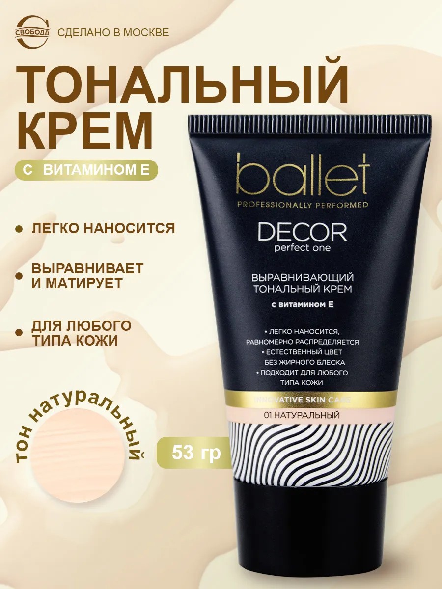 Тональный крем Ballet тон 01 Натуральный — классический выбор для повседневного макияжа. Лёгкая кремовая текстура равномерно распределяется по коже лица, выравнивает тон и создаёт аккуратный матовый бархатистый финиш без жирного блеска. Оттенок натуральный бежевый (тон 01) смотрится естественно, подстраивается под цвет кожи и подходит для дневного макияжа, офиса и учёбы. Формула универсальна для всех типов кожи, но особенно удобна для комбинированной и склонной к жирности в Т-зоне, помогая сохранить свежий вид в течение дня.