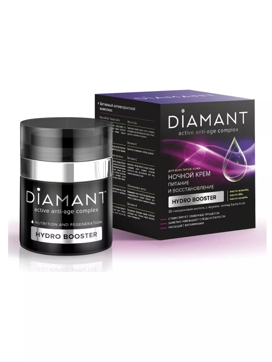 SVOBODA Крем Diamant ночной питание и восстановление 50 мл. Многофункциональный крем «DIAMANT» разработан специально для ночного ухода за вашей кожей. Ночное время - это идеальный период для отдыха и восстановления кожи. Мышцы лица расслабляются, клеточный обмен становится интенсивнее, кожа более восприимчива к активным компонентам, содержащимся в креме. Именно потому в это время происходит глубокая коррекция возрастных признаков. Антивозрастной комплекс стимулирует обменные процессы, снимает усталость и напряжение кожи, накопленные в течение дня. Он содержит 10 активных компонентов, которые способствуют интенсивному питанию и омоложению кожи, улучшают её эластичность, увеличивают плотность дермы и повышают упругость. Благодаря новым вакуумным дозаторам продукт не вступает в реакцию с кислородом, а значит - не окисляется. Также применение в упаковке современного дозатора позволило существенно сократить количество используемых консервантов, т. к. теперь риск попадания микробов внутрь баночки сведен практически к нулю. Благодаря использованию новейших средств доставки активных компонентов в глубокие слои эпидермиса эффект anti-age достигается быстрее и на более продолжительное время. Главный anti-age компонент - 3D гиалуроновая кислота, молекулы которой связаны трёхмерной решёткой. Благодаря этому молекулы гиалуроновой кислоты дольше остаются целыми, а, значит, связывают и удерживают влагу на более долгое время.