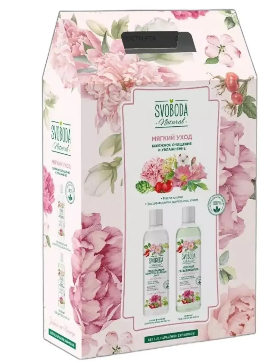 Ухаживающий шампунь-бальзам 2 в 1 – идеальное решение для быстрого и бережного ухода за волосами. Экстракты липы, шиповника, хмеля, масло хлопка в составе шампуня-бальзама заботятся о коже головы и волосах, обеспечивая их необходимым питанием и увлажнением, делая волосы сильными и блестящими. Без SLS, парабенов, силиконов.Подарите себе минуты свежести и расслабления с нежным гелем для душа SVOBODA Natural Мягкий уход. Гель обладает тонким ароматом, деликатно очищает кожу, а экстракты липы, шиповника, хмеля, масло хлопка в составе заботятся о коже, обеспечивая ее необходимым питанием и увлажнением. Без SLS, парабенов, силиконов.