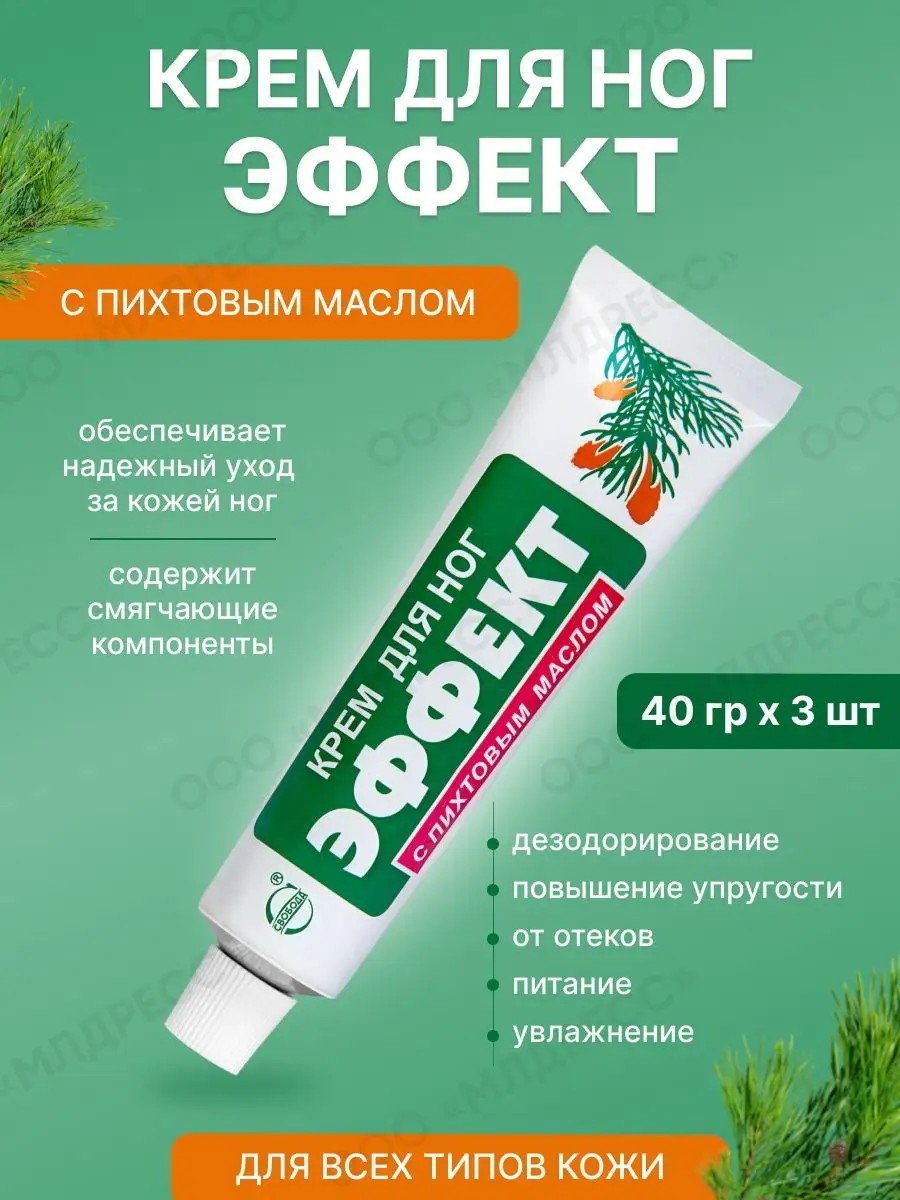 Крем для ног "Эффект"с пихтовым маслом. Крем обладает легкой консистенцией, быстро впитывается, цвет нежный молочный белый, имеет легкий, не навязчивый аромат хвои.