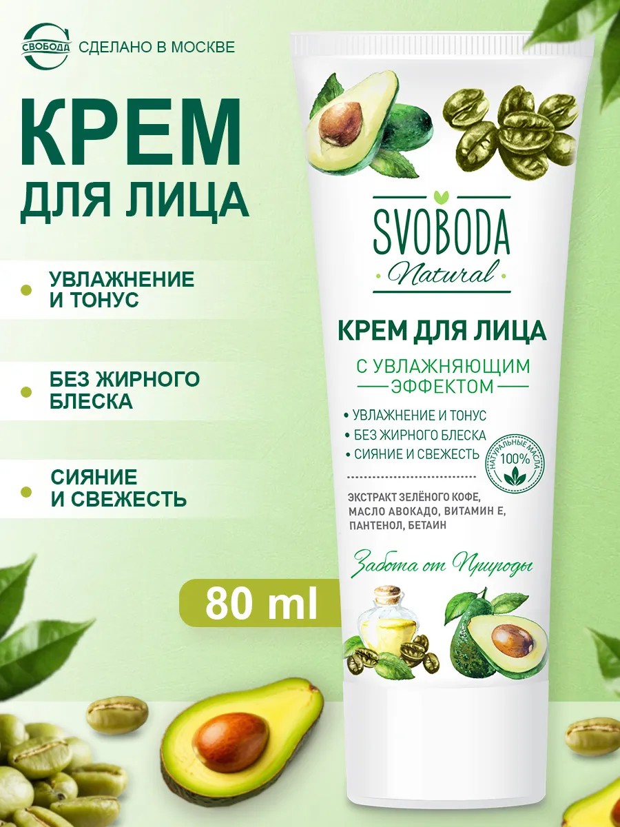 Крем СВОБОДА обеспечивает полноценный уход за кожей, помогая сохранить ее эластичной, нежной и молодой. Активные ингредиенты витамин Е, D-пантенол, экстракт зеленого кофе, масло авокадо, глицерин и специальный натуральный увлажняющий компонент бетаин: - увлажняют и смягчают кожу, регулируют ее водный баланс; - повышают тонус, эластичность и упругость кожи, обеспечивая лифтинг-эффект; - оказывают антиоксидантное действие, предохраняя от преждевременного старения. Применение: ежедневно наносите крем на чистую кожу лица и шеи утром и/или днем.
