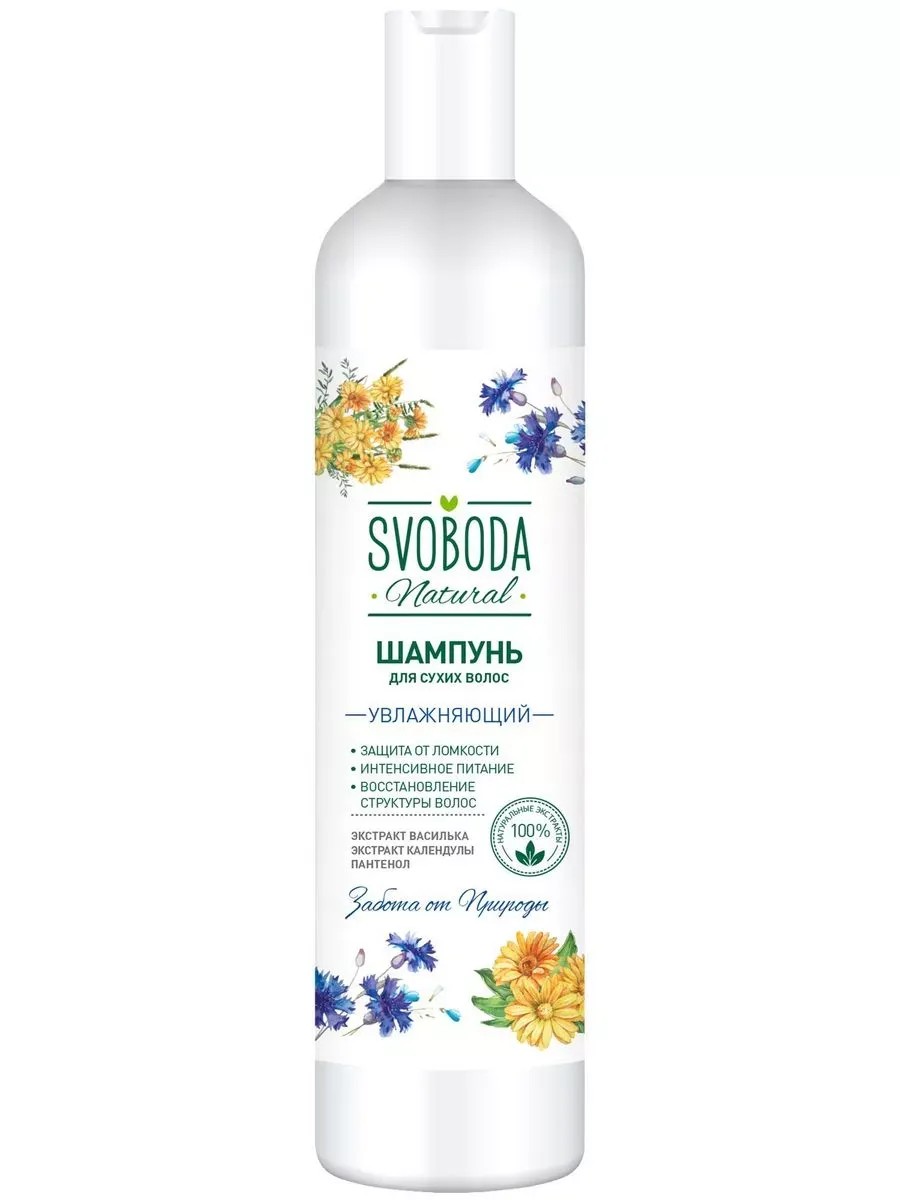 SVOBODA, Шампунь Natural для сухих волос 430 мл, 1 шт. Нейтральная моющая основа мягко очищает волосы. Пантенол глубоко проникает внутрь волос, восстанавливает структуру изнутри от корней до самых кончиков. Комплекс экстрактов из цветков василька и календулы активизирует рост волос, препятствует их ломкости, а так же оказывает успокаивающее и противовоспалительное действие на кожу головы.