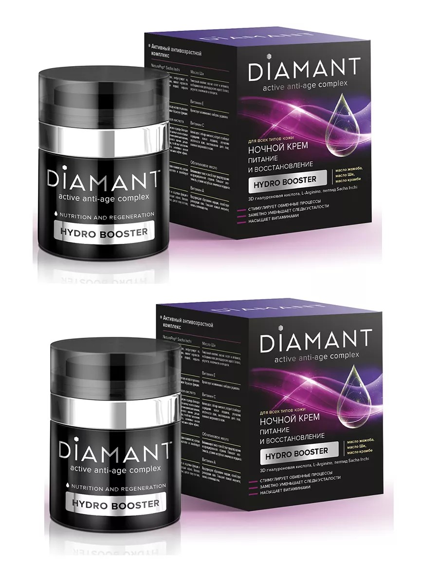 The multifunctional DIAMANT cream is specially designed for nighttime care. It contains an anti-aging complex that stimulates metabolic processes and relieves fatigue and tension accumulated during the day. It contains 10 active ingredients that promote intensive nourishment and rejuvenation of the skin, improve its elasticity, increase dermal density, and enhance firmness. The cream's delicate, velvety texture is quickly absorbed and leaves no greasy or sticky film on the face. Active anti-aging complex: NaturePep Sacha Inchi – a natural peptide that reduces sagging skin, increases dermal density, and reduces unevenness. Skin becomes smoother, and wrinkles are reduced. L-Arginine – an amino acid similar to the elixir of youth for the skin. It moisturizes, nourishes, and supports the skin's barrier function. 3D Hyaluronic Acid – has a three-dimensional molecular structure, providing long-lasting hydration. Promotes skin rejuvenation, improves elasticity, and significantly reduces the appearance of deep wrinkles, providing a lifting effect. Jojoba oil contains a high concentration of amino acids similar in composition to collagen, which is responsible for skin elasticity. Crambe oil is the oil of Abyssinian mustard. It slows down the formation of wrinkles, improves skin tone, and tightens it. It is a natural antioxidant. Shea butter is a unique complex of fatty acids and vitamins necessary for the skin to maintain moisture balance, firmness, and elasticity. Vitamin E prevents the formation of free radicals. Vitamin C is an antioxidant, an anti-aging component that helps reduce fine wrinkles, improve skin elasticity, restore complexion, and reduce skin roughness. Sea buckthorn oil saturates the skin with vitamins and helps prevent its premature aging. Vitamin A is an antioxidant that prevents the formation of wrinkles, promotes skin regeneration, and improves skin immunity.