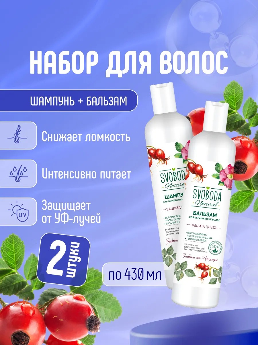 Набор косметики для окрашенных волос с экстрактом шиповника Svoboda Natural – это идеальный выбор для тех, кто хочет сохранить яркость и насыщенность цвета своих волос, а также обеспечить им необходимый уход и защиту.