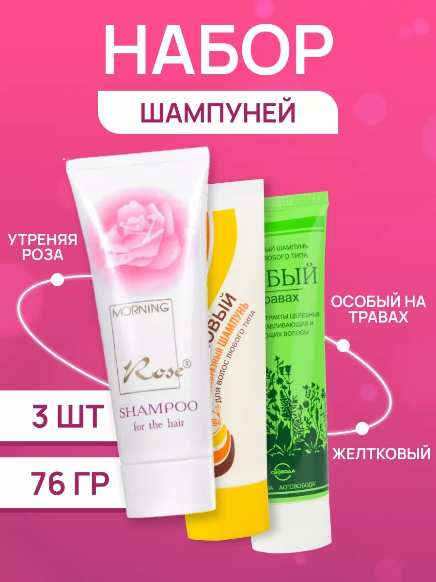 | Комплектация | Шампуней Желтковый 76г - 1 шт; Шампунь Особый на травах для всех типов волос 76г - 1 шт; Шампунь Утренняя роза 76г - 1 шт |