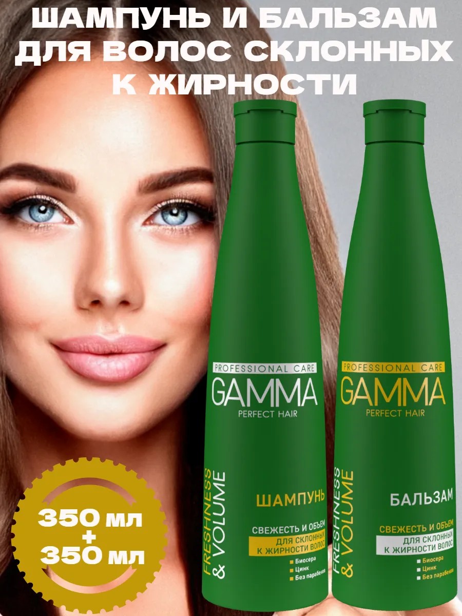 The set includes Gamma Perfect Hair Freshness and Volume Shampoo for oily hair, as well as Conditioner for oily hair from the same series.