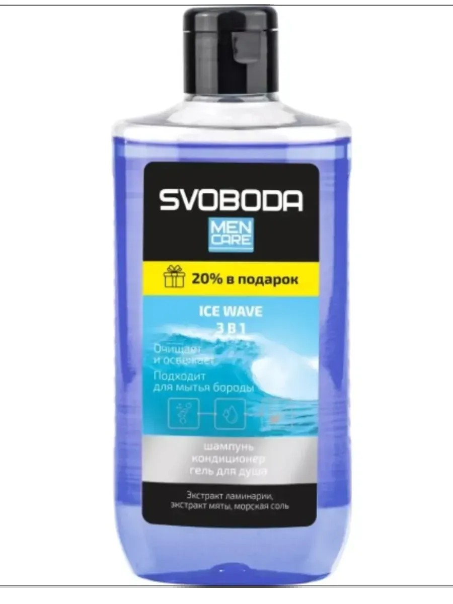 Свобода, Шампунь-бальзам-гель 3 в 1 Men Care Iсe Wave, 300 мл. В основе средства лежит уникальная формула, позволяющая одновременно заботиться о кожном покрове и волосах. Богатый состав включает экстракты морских водорослей и мяты, которые обеспечивают мягкость и увлажнение, а также природную морскую соль, дарящую коже ощущение свежести. Компоненты, входящие в состав, создают защитный барьер от внешних воздействий и предотвращают обезвоживание, оставляя вас бодрыми на протяжении всего дня.