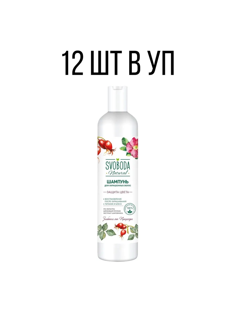 SVOBODA Shampoo for Colored Hair, 430 ml, 12 pcs. Designed to protect color, restore, and nourish color-treated hair. The shampoo's neutral cleansing base gently cleanses hair. UVA/UVB filters protect against UV rays and preserve hair color for a long time. The shampoo contains silk proteins, similar in composition to natural hair proteins. They penetrate deeply into damaged areas of the hair, restore its structure, and protect against brittleness and fragility. Rosehip extract, containing natural vitamin C, carotene, and trace elements, nourishes hair, giving it silkiness and shine, and, with a pronounced antioxidant effect, protects hair from harmful environmental influences.