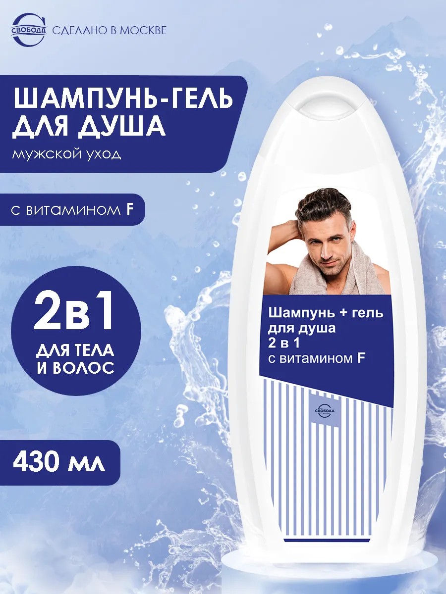 Шампунь гель для душа 2 в 1 с витамином F от фабрики Свобода — универсальное средство для мужчин, подходящее для волос и тела: это шампунь и гель для душа в одной бутылке. Мужской шампунь гель 2 в 1 экономит время и место, а флакон 430 мл обеспечивает большой объём и экономичный расход. Средство мягко и эффективно очищает, придаёт волосам опрятный вид и свежесть, поддерживает ежедневное использование и подходит для всех типов волос и кожи.