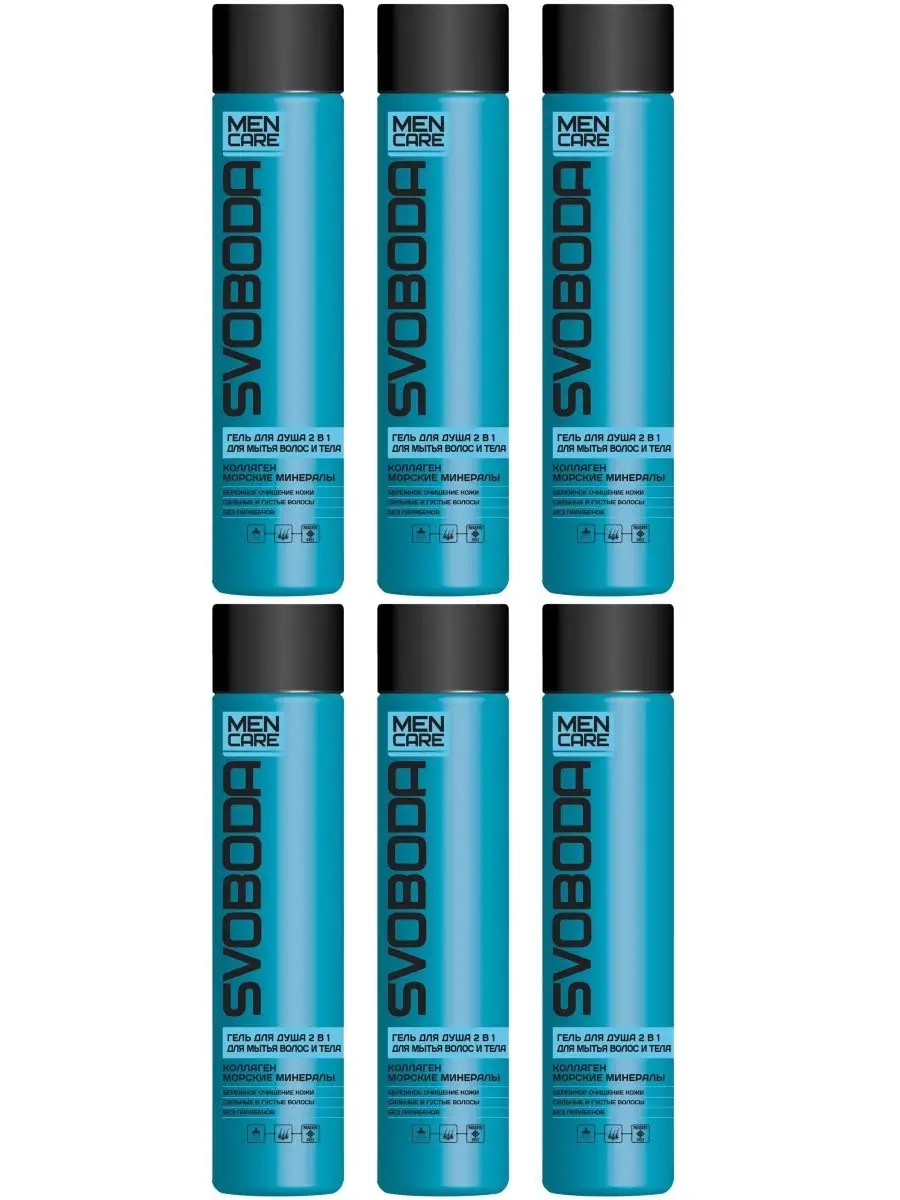 SVOBODA MEN CARE Гель для душа 2в1 коллаген, морские минералы во флаконе, 300мл, набор 6 штМужской гель для душа и волос обеспечивает идеальный уход за мужскими волосами и телом. Коллаген уплотняет волосы, делает их более сильными и упругими, создавая эффект густых волос. Морские минералы, содержащие комплекс природных макро- и микроэлементов, активизируют обменные процессы в коже, ускоряя ее обновление. Мужской гель для душа подходит для ежедневного использования. Благодаря компактному размеру удобно брать в поездки и спортзал. Не содержит парабенов.