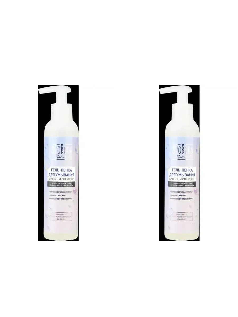 SVOBODA GEL-FOAM FOR CLEANSING RADIANCE AND FRESHNESS 185ML Svoboda Natural Glow and Freshness gel-foam for washing. Appearance: Delicate gel texture with a fruity aroma. Active ingredients: Contains hyaluronic acid, panthenol, AHA complex. Delicate gel-foam gently cleanses the skin of impurities and makeup, without causing overdrying and irritation. The included hyaluronic acid intensively moisturizes the skin and gives it tone. Panthenol has a calming effect and stimulates the process of natural skin renewal. AHA complex, including fruit acids and extracts, saturates the skin with vitamins and restores the skin's natural radiance. Action: 1. Gently cleanses the skin 2. Removes makeup 3. Moisturizes and tones. For external use only. In case of contact with eyes, rinse with water.0