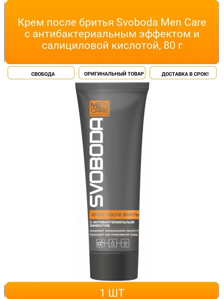 | Комплектация | Крем после бритья Svoboda Men Care с антибактериальным эффектом и салициловой кислотой, 80 г |
