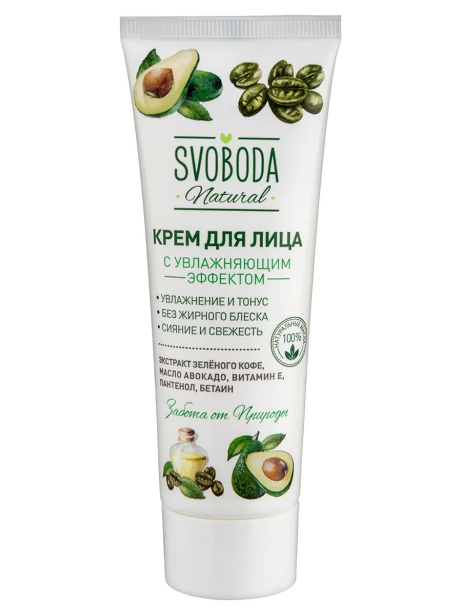 SVOBODA КРЕМ ДЛЯ ЛИЦА С УВЛАЖНЯЮЩИМ ЭФФЕКТОМ - для всех типов кожи. Внешний вид и свойства: Кремовая текстура светло-бежевого цвета с легким, освежающим ароматом Крем обеспечивает полноценный уход за кожей, помогая сохранить ее эластичной, нежной и молодой. Активные ингредиенты - витамин Е, D-пантенол, экстракт зеленого кофе, масло авокадо, глицерин и специальный натуральный увлажняющий компонент бетаин: • увлажняют и смягчают кожу, регулируют ее водный баланс; • повышают тонус, эластичность и упругость кожи, обеспечивая лифтинг-эффект; • оказывают антиоксидантное действие, предохраняя от преждевременного старения. Результат: • увлажнение и тонус • без жирного блеска • сияние и свежесть