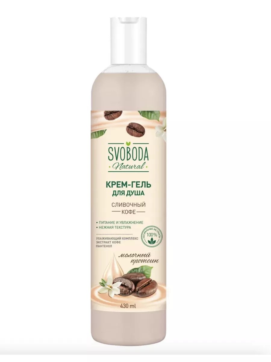 Гель для душа SVOBODA Сливочный кофе, 430мл | Svoboda Natural (Свобода косметика) | Нежная текстура крем-геля для душа и сладостно-бодрящий аромат сливочного кофе превращают ежедневное очищение кожи в наслаждение. Крем-гель содержит молочный протеин, экстракт кофе, глицерин и инновационную высокоэффективную добавку с глубоким ухаживающим действием. Эти ценные компоненты обеспечивают деликатное очищение, питание и увлажнение, помогая сохранить красоту кожи.