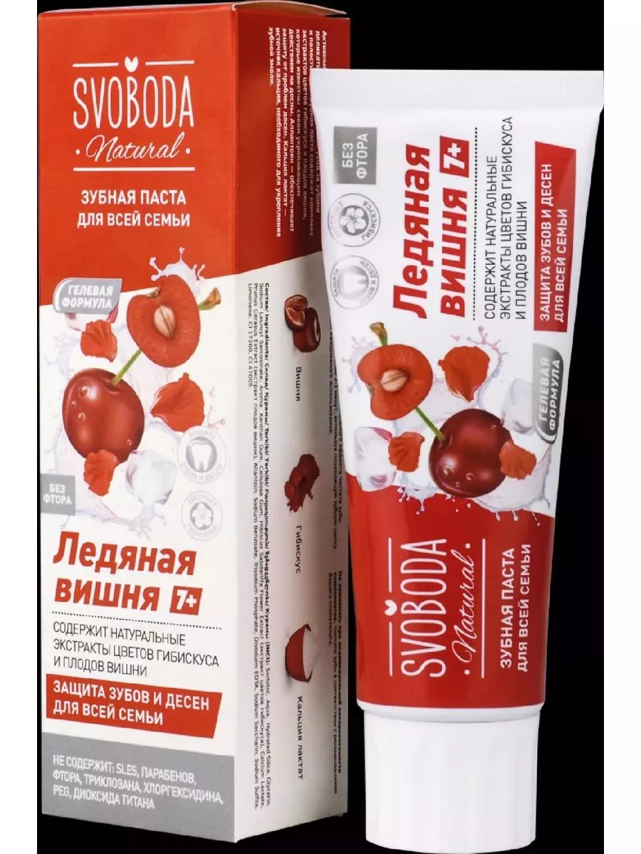 SVOBODA ЗУБНАЯ ПАСТА ДЛЯ ВСЕЙ СЕМЬИ ЛЕДЯНАЯ ВИШНЯ 7+ 98,0Зубная паста для всей семьи Svoboda Natural Ледяная вишня 7+Чистите зубы в соответствии с рекомендациями Вашего стоматолога