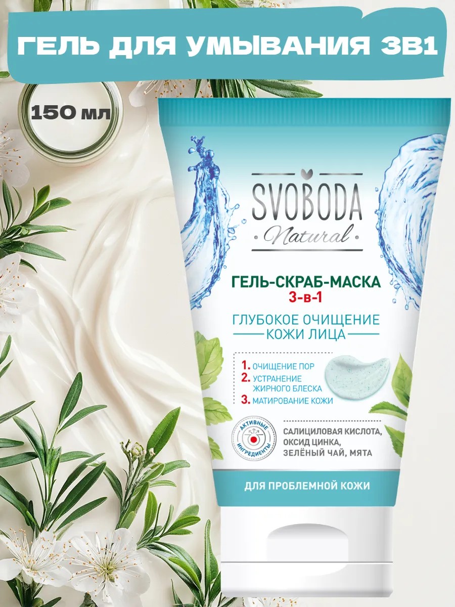 Глубокое очищение кожи лица средство 3в1 Гель-Скраб-Маска SVOBODA Natural.