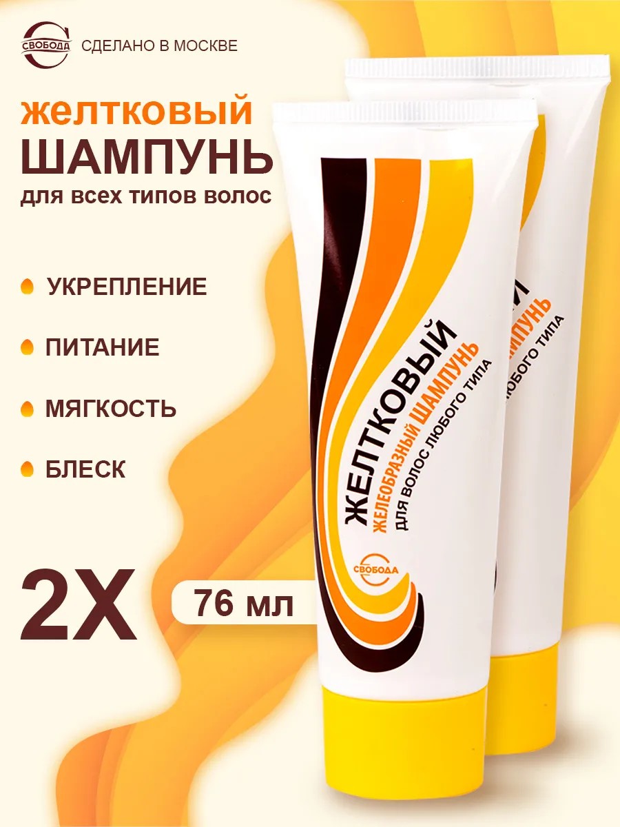 Питательный желтковый шампунь Свобода без силиконов и парабенов c натуральным яичным маслом (витамины A, D, E) мягко очищает, укрепляет и придаёт волосам шелковистый блеск — удобный набор 2 × 76 г в алюминиевых тубах.