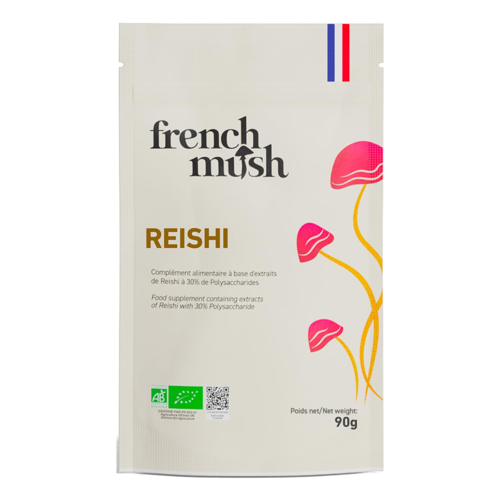 French Mush Doypack - Reishi Powder - 90g Vegan - Soothing Promotes restful sleep and relaxation - Mix with food or drinks - Organic Reishi extract powder - Lab tested