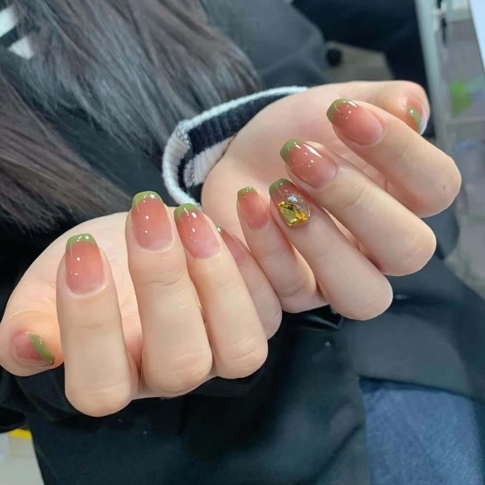 French Tip Press on Nails - Short Round Press On Nails with Nail Tips Green French Freshing Sparkling Diamond Design Glossy Gradient color press on nails Acrylic False Nails Cute Artificial Nails