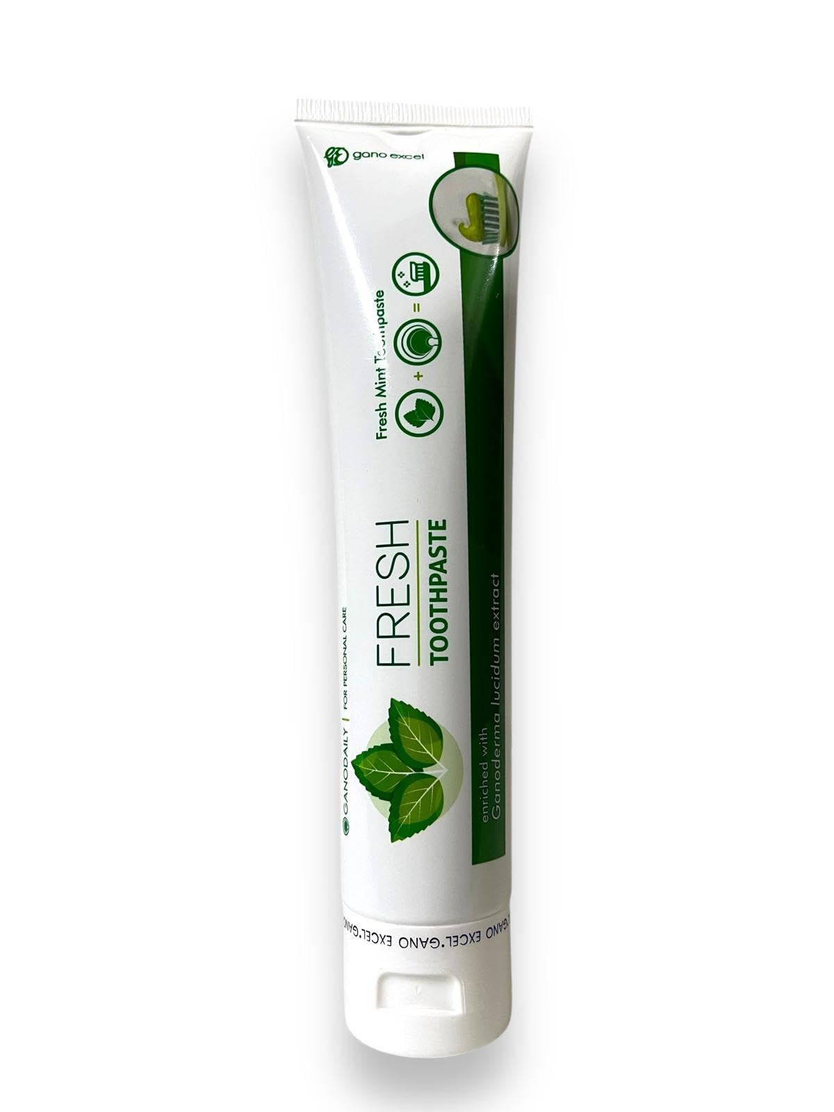 Fresh by Gano Exel All-Natural Toothpaste Enriched with Ganoderma lucidum. Enjoy a Bright Smile and Healthy Gums with This Refreshing Non-Abrasive Toothpaste Flouride-Free.