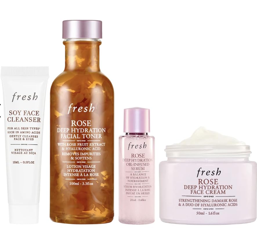 0.5 oz 15 mL Soy pH-Balanced Hydrating Face Wash. 1.69 oz 50 mL Rose Hyaluronic Acid Deep Hydration Moisturizer. 0.67 oz 20 mL Rose Squalane Deep Hydration Oil-Infused Serum. 3.3 oz 100 mL Rose Hyaluronic Acid Deep Hydration Toner. This Set Contains:. A hydrating, four-piece set featuring a travel-size face wash, toner, and serum, along with a full-size face cream.