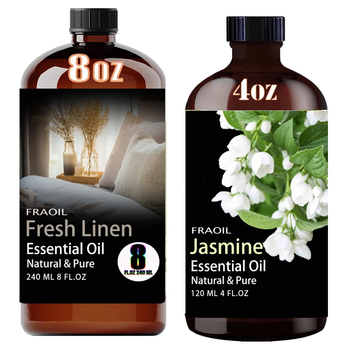 Fresh Linen Essential Oil 8 Fl Oz and Jasmine Essential Oil 4 Fl Oz for Diffuser Humidifier Yoga Cleaning DIY Candle Soap Making Perfume Gift for Essential Oils