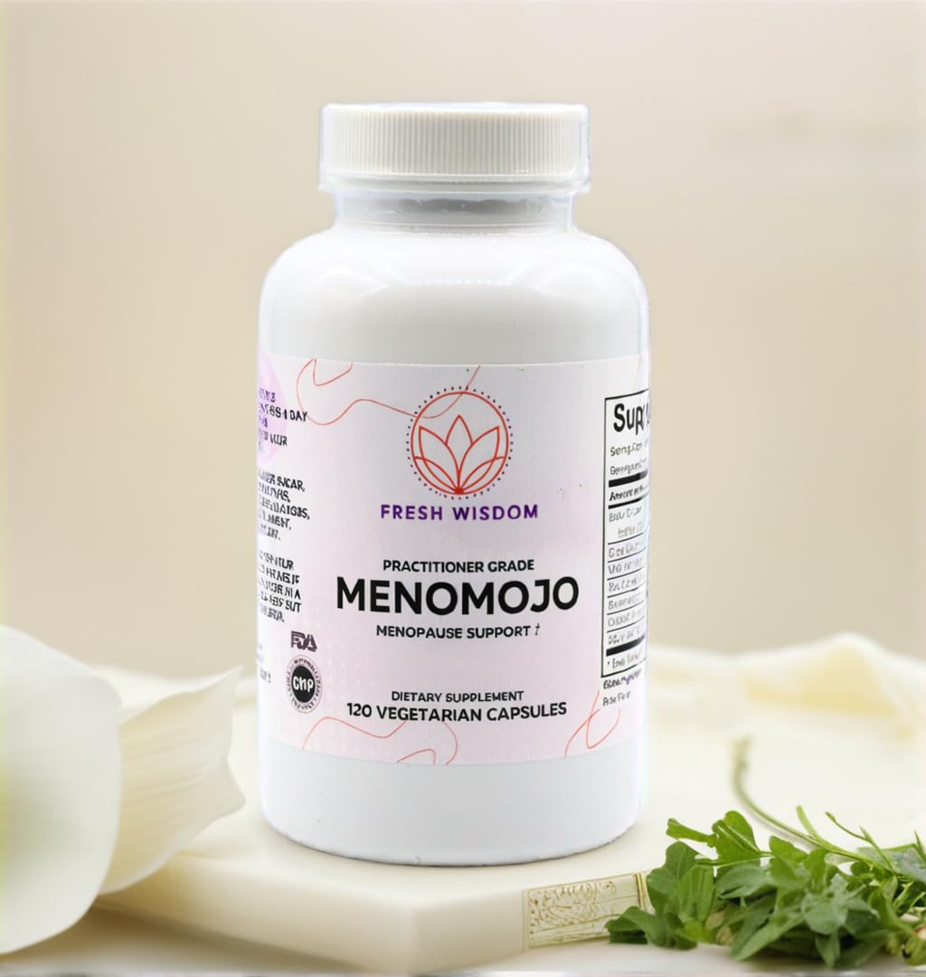 SAFE and EFFECTIVE — This product has a trustworthy safety record and is free of gluten, dairy, soy, corn, yeast, artificial flavors, artificial colors, artificial preservatives, and is vegetarian. NATURAL HOLISTIC RELIEF — Naturally sourced herbs such as black cohosh, dong quai, and wild yam for traditional menopausal support along with unique herbs like sage and rehmannia glutinosa for a stronger more holistic effect. DESIGNED WITH CLINICAL EXPERIENCE — Designed by doctors for doctors. Meant to meet the standards of doctors whose reputations depend on effective products. Created using not just researched ingredients, but clinical experience of what really works. MENOPAUSE HOTFLASH SUPPORT — Professional Grade. Serious support for relief of hot flashes and night sweats for better sleep, more energy, less irritability, so you can get on with your day without the inconvenience. Fresh Wisdom MenoMojo Menopause Support Reduces frequency and severity of hot flashes during menopause. All Natural Gluten free. 120 vegetarian capsules.